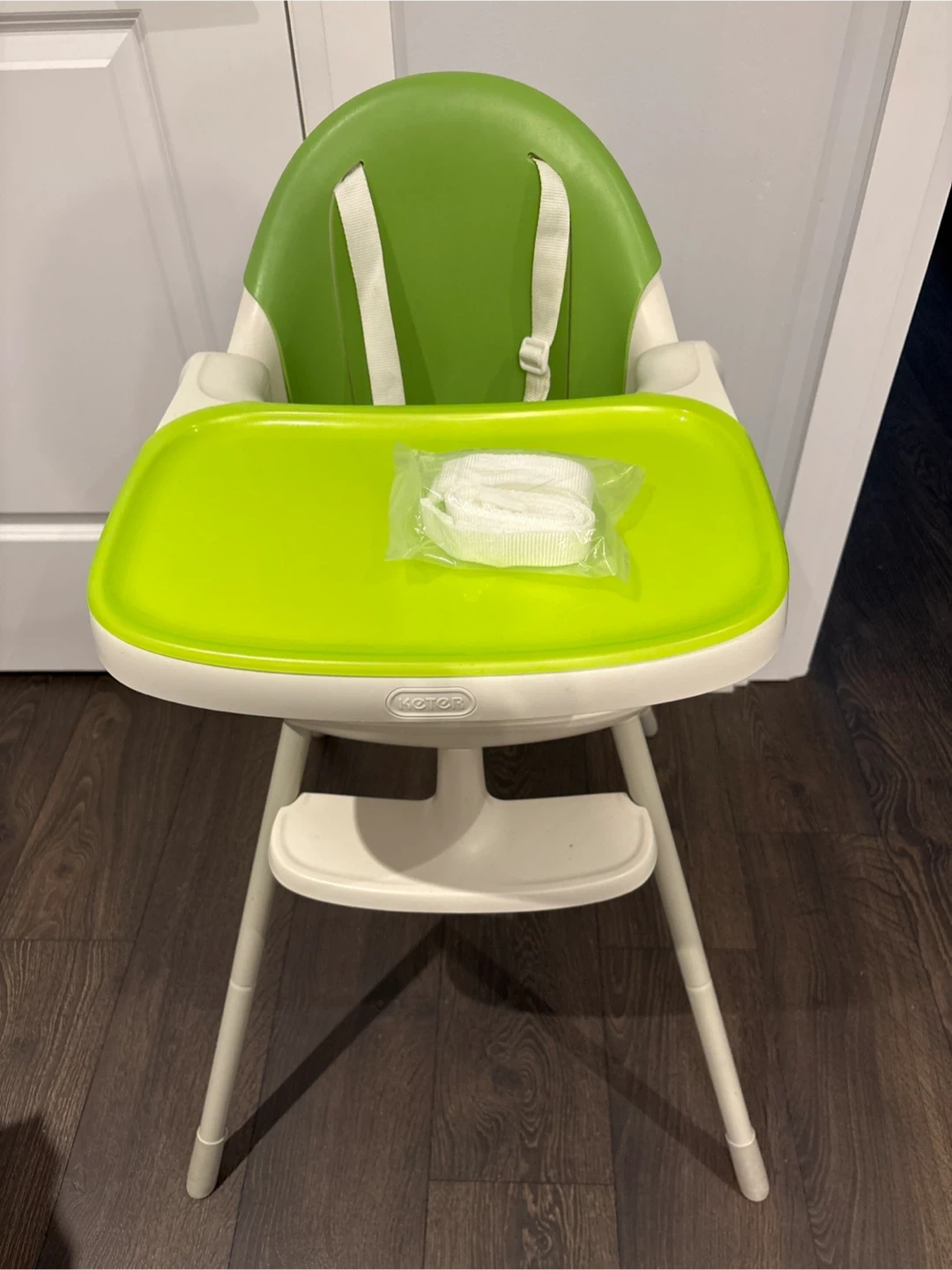 Selling a used Keter baby high chair in a fresh green and white colour scheme! It's in great shape and comes with the new high chair straps.