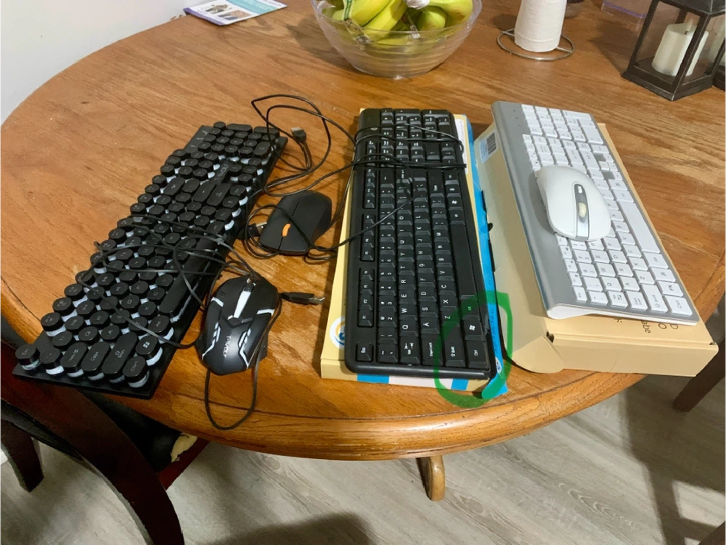 Selling a bundle of keyboards and mice. Includes a retro-style black keyboard, a standard black keyboard, and a silver keyboard with a white mouse. Great for anyone needing extra peripherals!