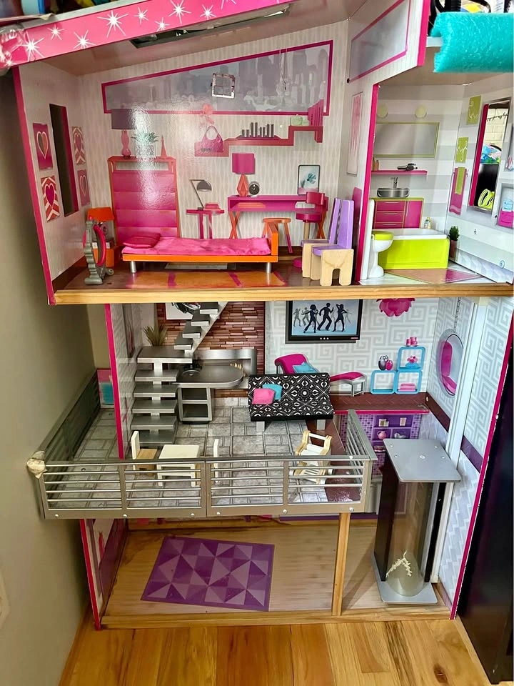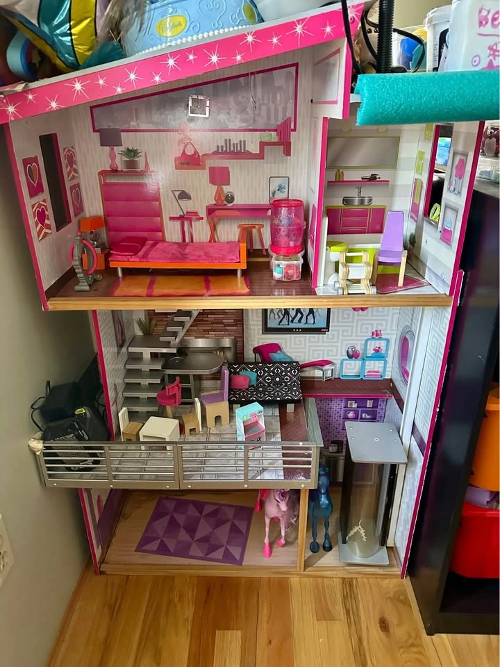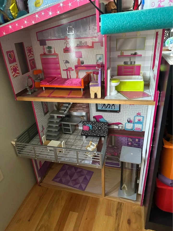 Good condition KidKraft Modern Luxury Dollhouse, designed to accommodate 18-inch dolls. No accessories included. Please note, item is quite large and heavy and will need an SUV or truck to pickup. Approximate Assembled Dimensions in inches: 12 W x 32 L x 47 H