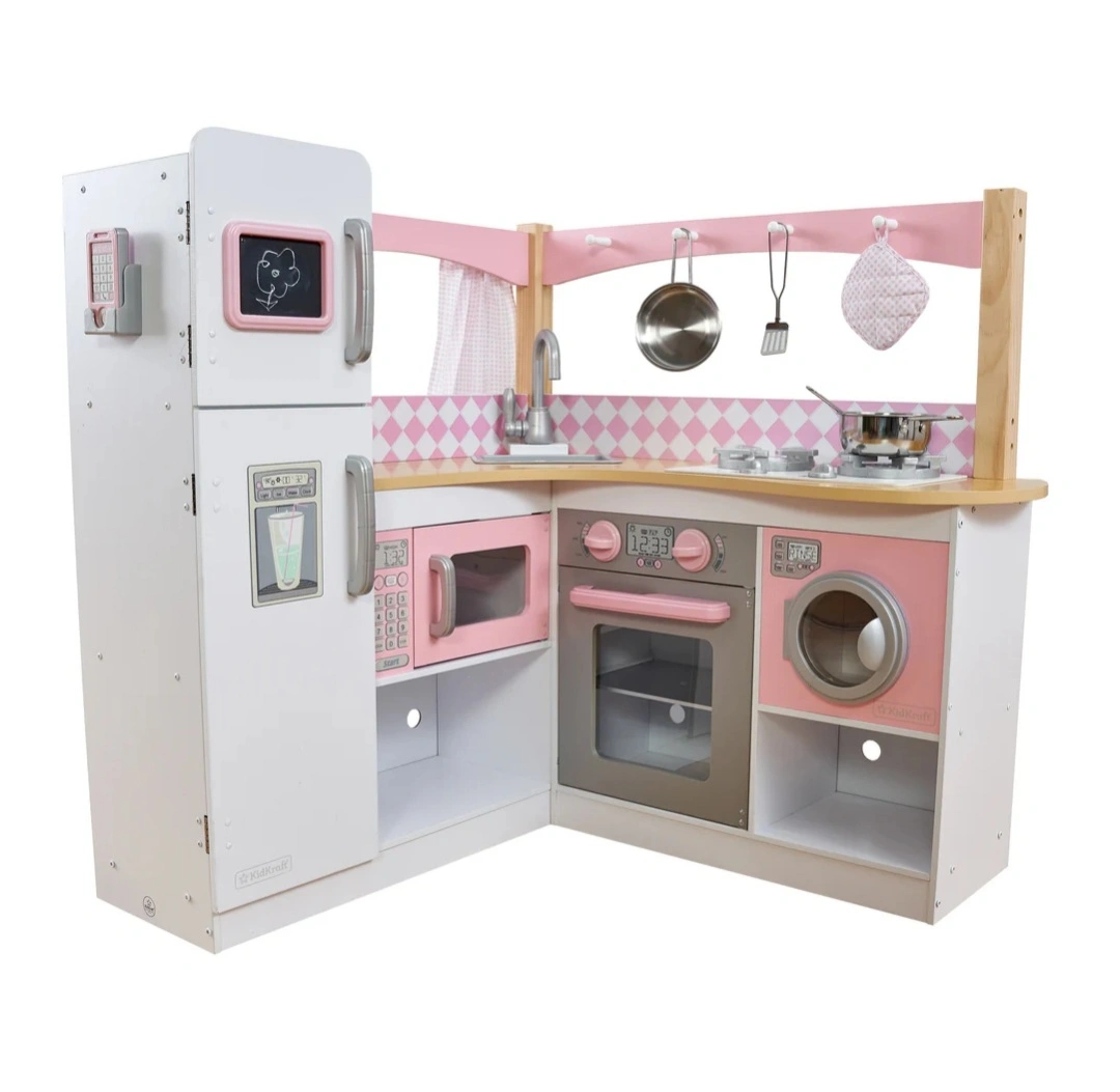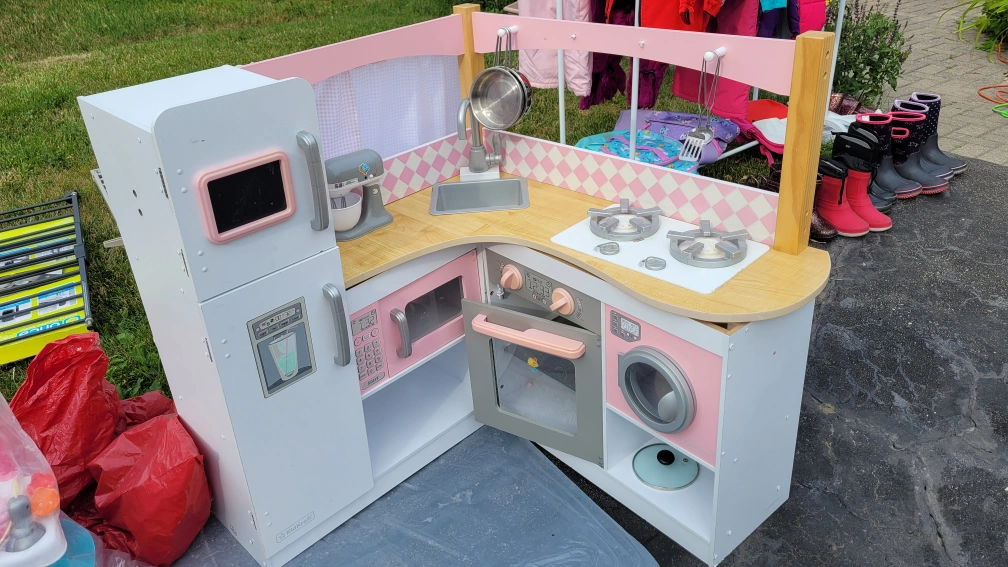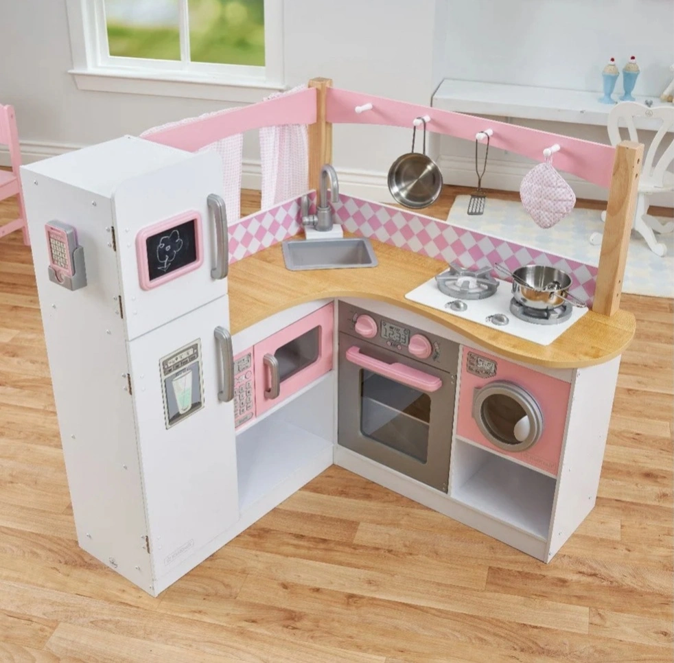 This KidKraft kitchen playset is perfect for your little chef! It features a refrigerator, microwave, oven, and washing machine for realistic play. The pink and white design is super cute and will look great in any playroom. Includes accessories like a pot, pan, and utensils. Gently used, Great condition and ready for a new home!