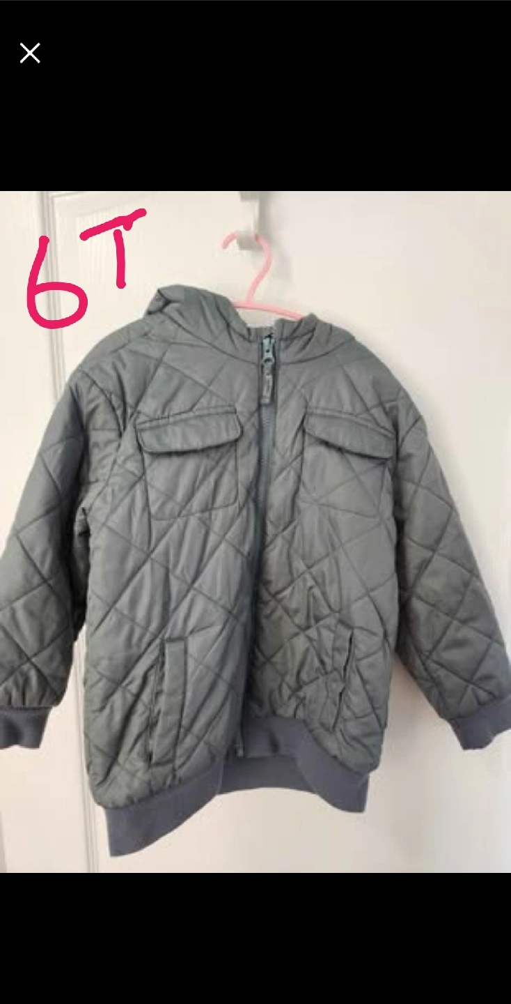Selling a gently used kids' quilted jacket in size 6T. It's a stylish grey colour and features a quilted design with functional pockets. Perfect for keeping your little one warm and cozy during cooler weather!