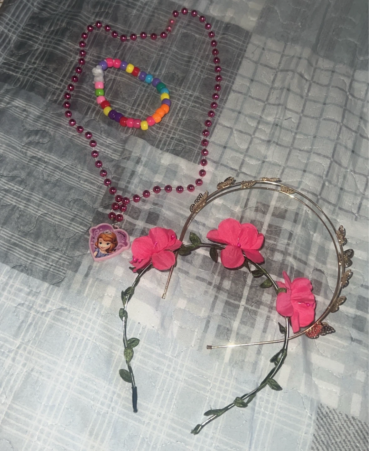 Set for kids! Includes a beaded necklace with a Sofia the First pendant, a colourful beaded bracelet, and a floral headband.