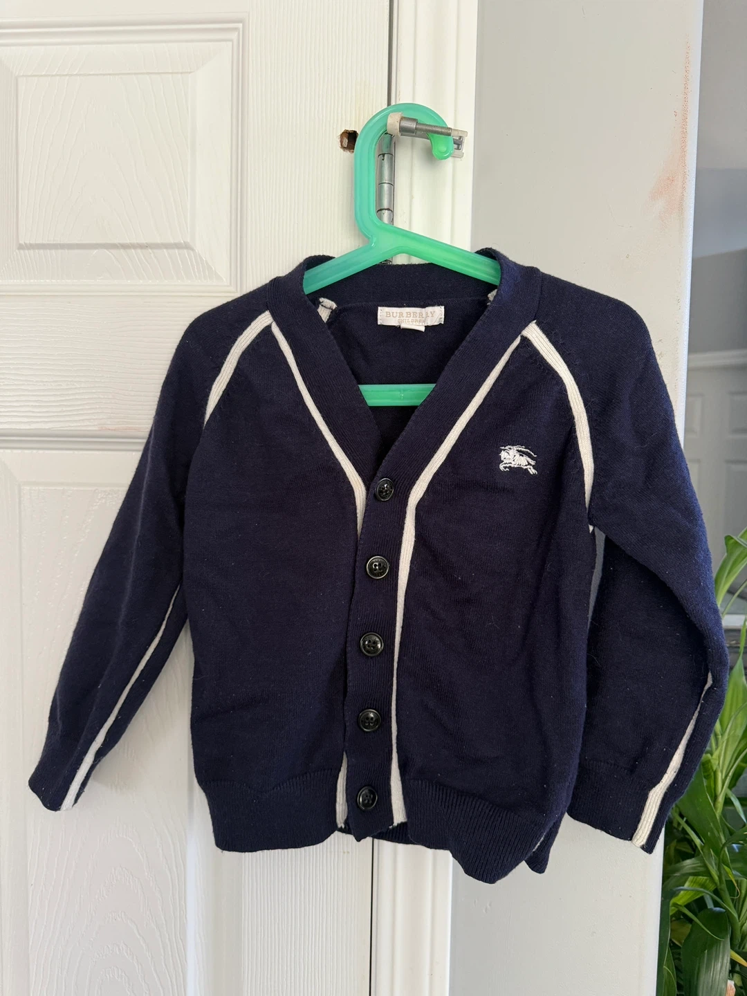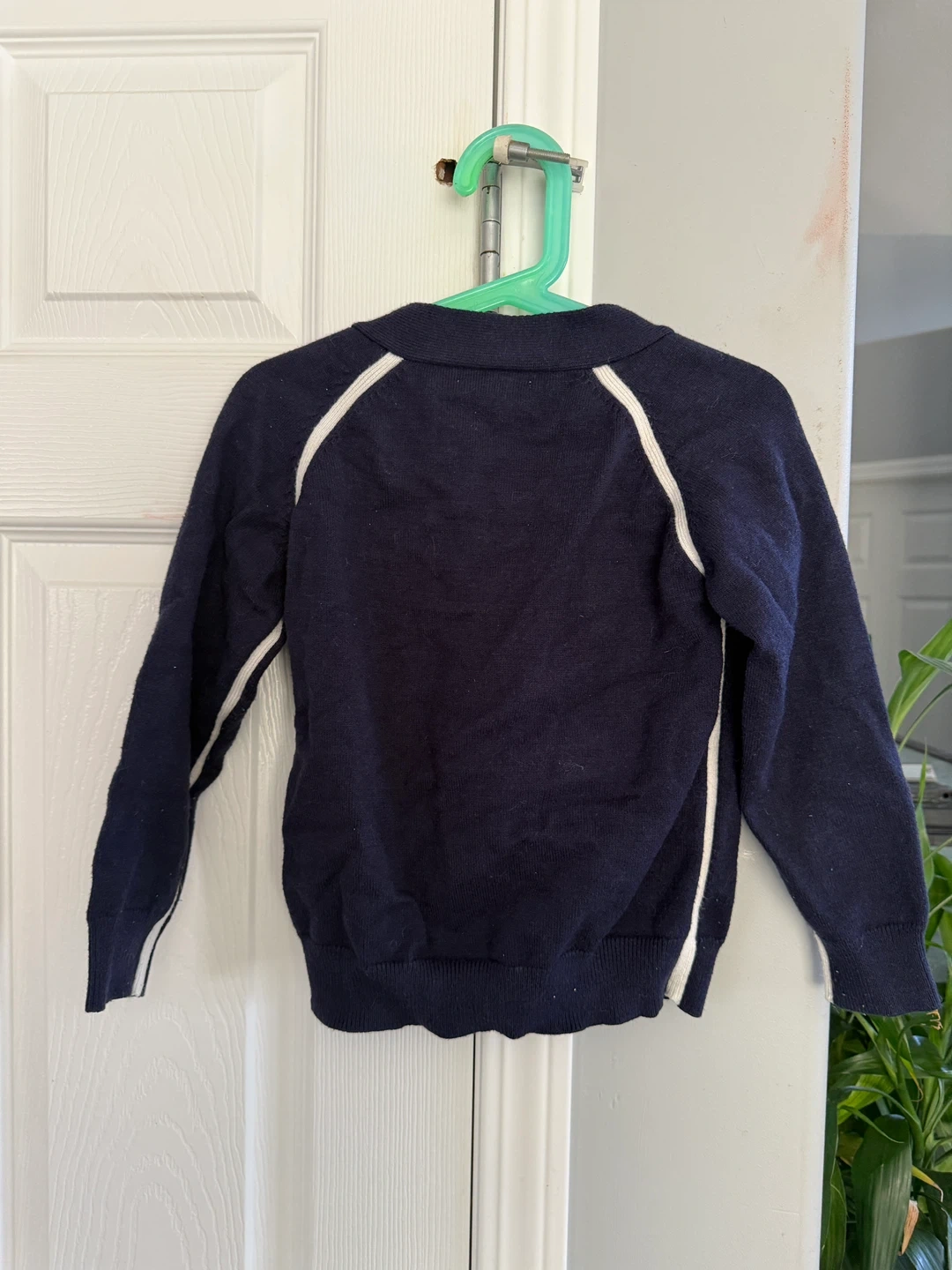 A stylish kids cardigan in navy blue, size 4Y! This cute cardigan features white stripes on the sleeves and around the neckline. It's in great condition and perfect for layering