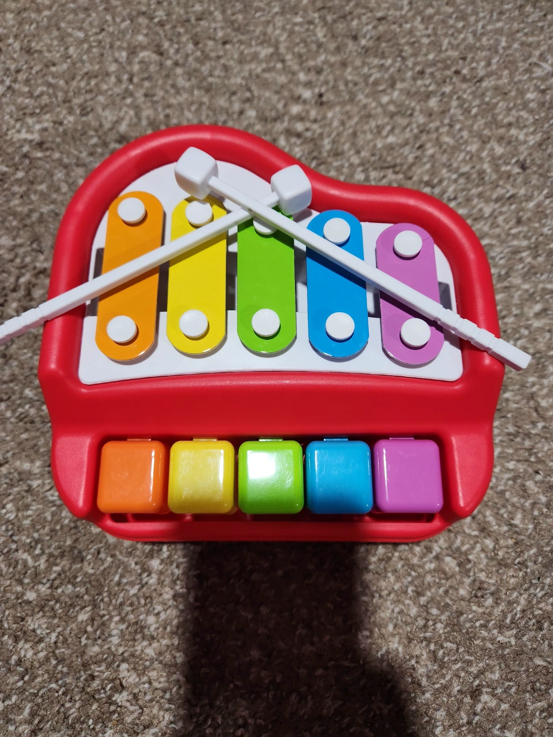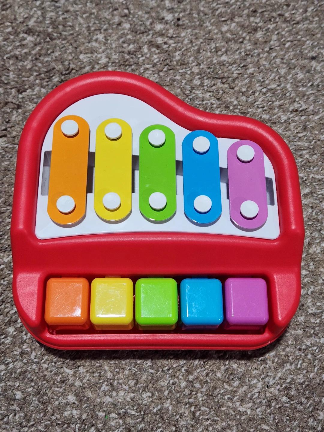 Colorful toy piano. Features xylophone and piano keys. Includes mallets, which store under the piano. Great for toddlers and preschoolers. Fun musical instrument.