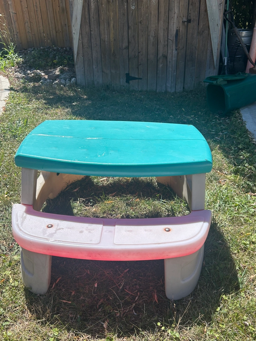 Selling a cute kids picnic table! It's turquoise on top with pink seating. Perfect for little ones to enjoy outdoor snacks and activities in the backyard or on the patio