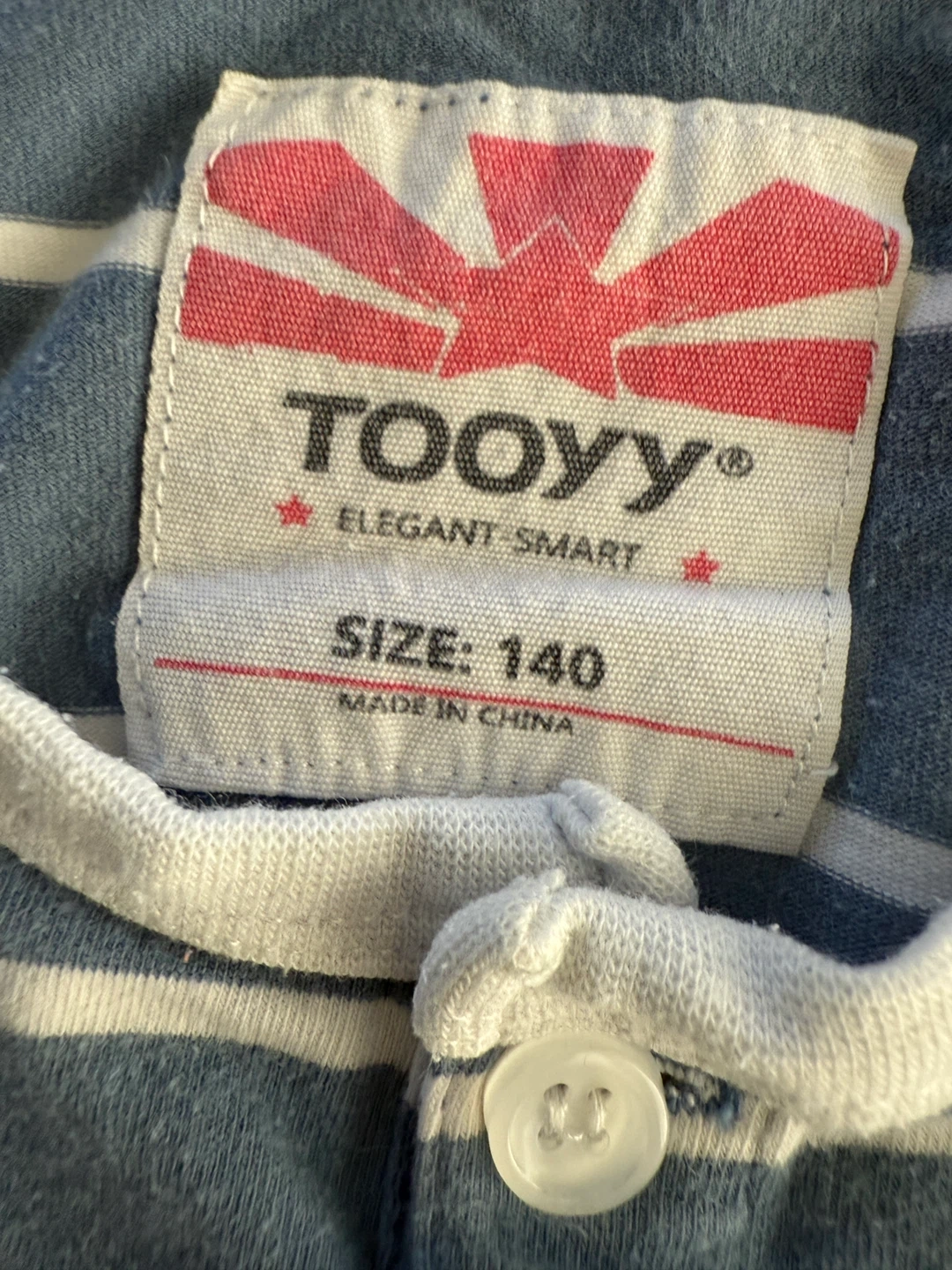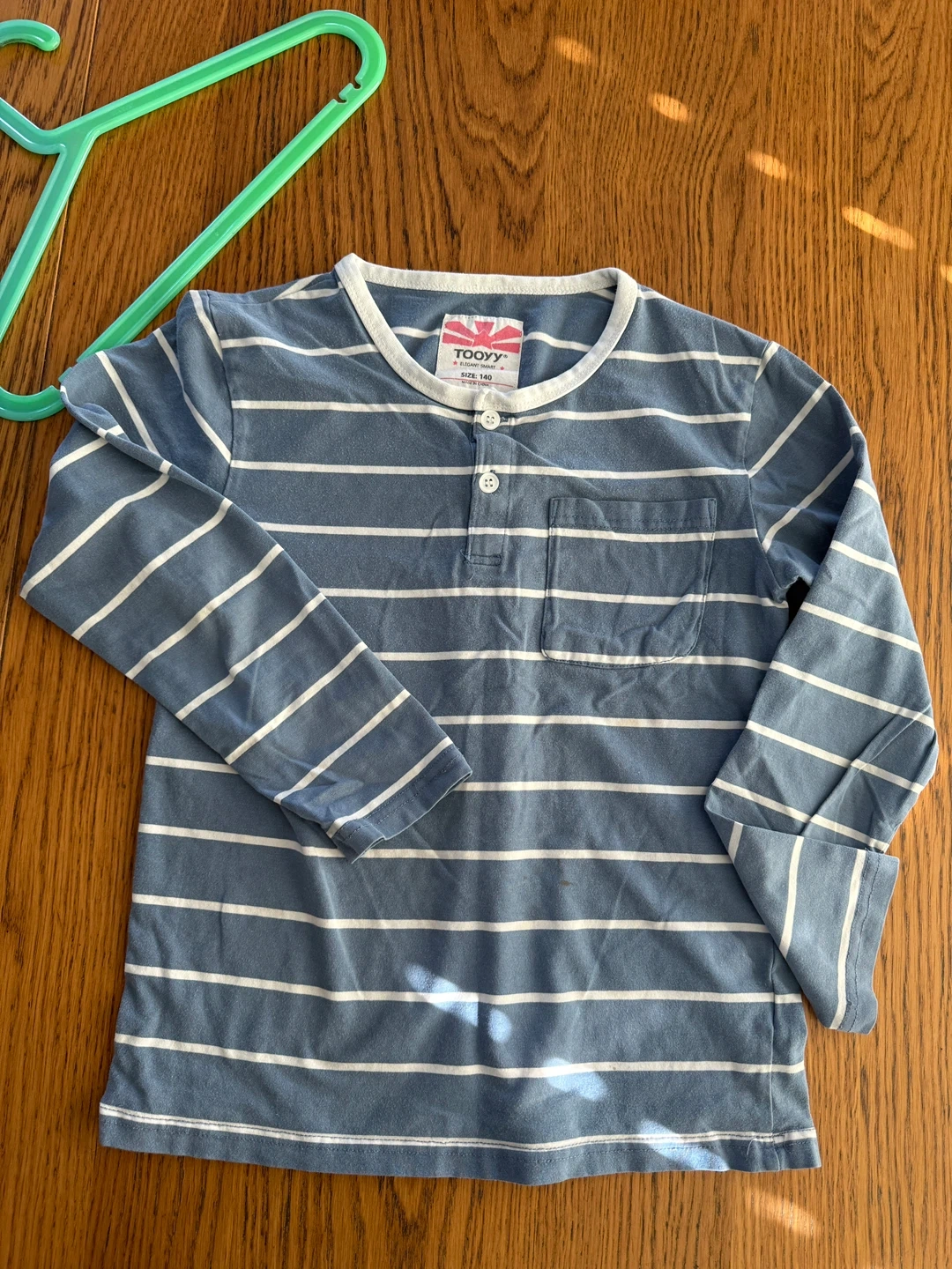 A cute striped long sleeve shirt. It features a button-up detail and a pocket on the chest. The size is 140.