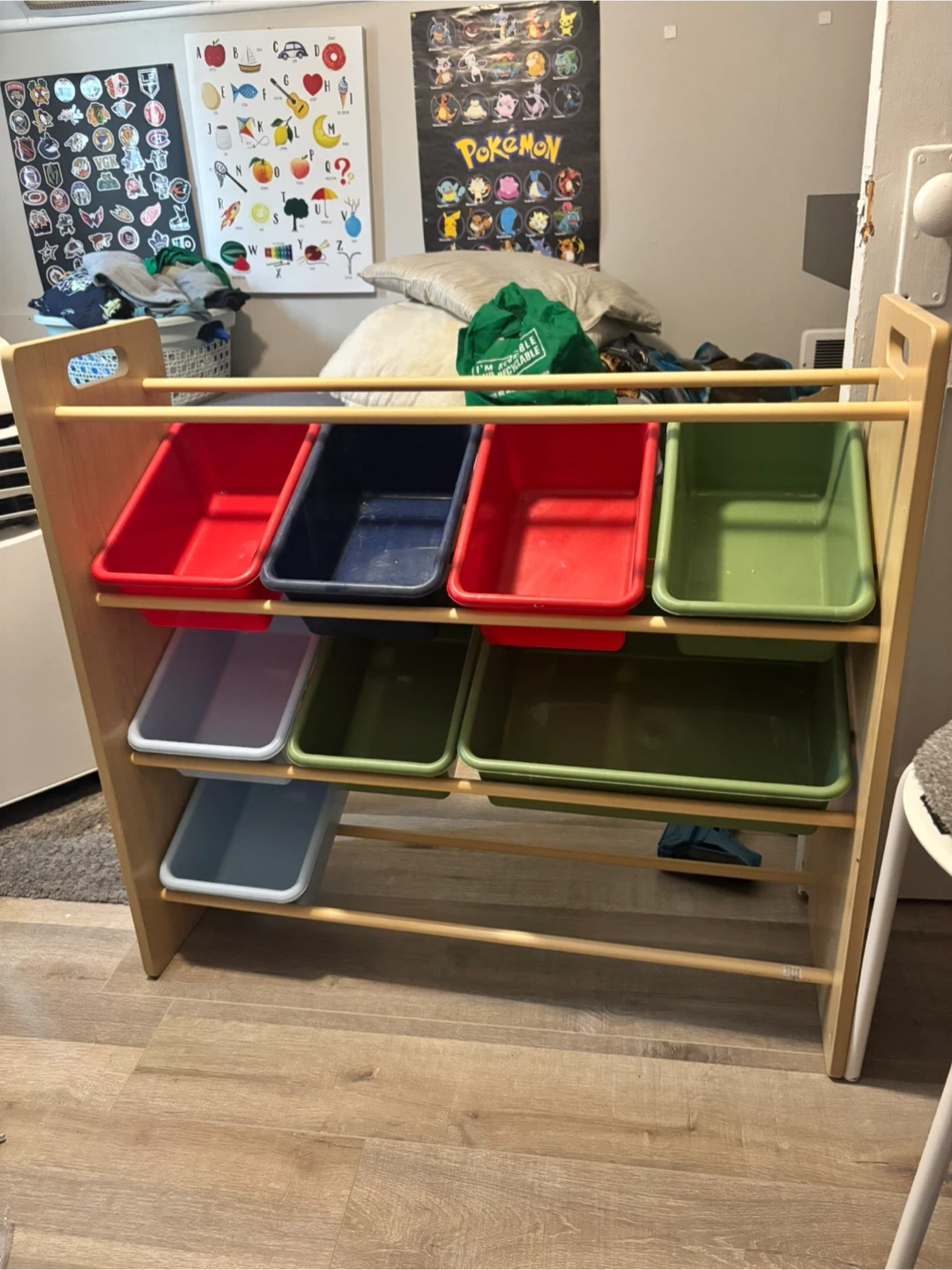 Declutter your kids' space with this handy toy storage shelf! It features multiple colourful bins for easy organization of toys, books, and more. Perfect for playrooms or bedrooms to keep everything tidy and accessible. Missing one small bin. There is a larger bin not pictured.