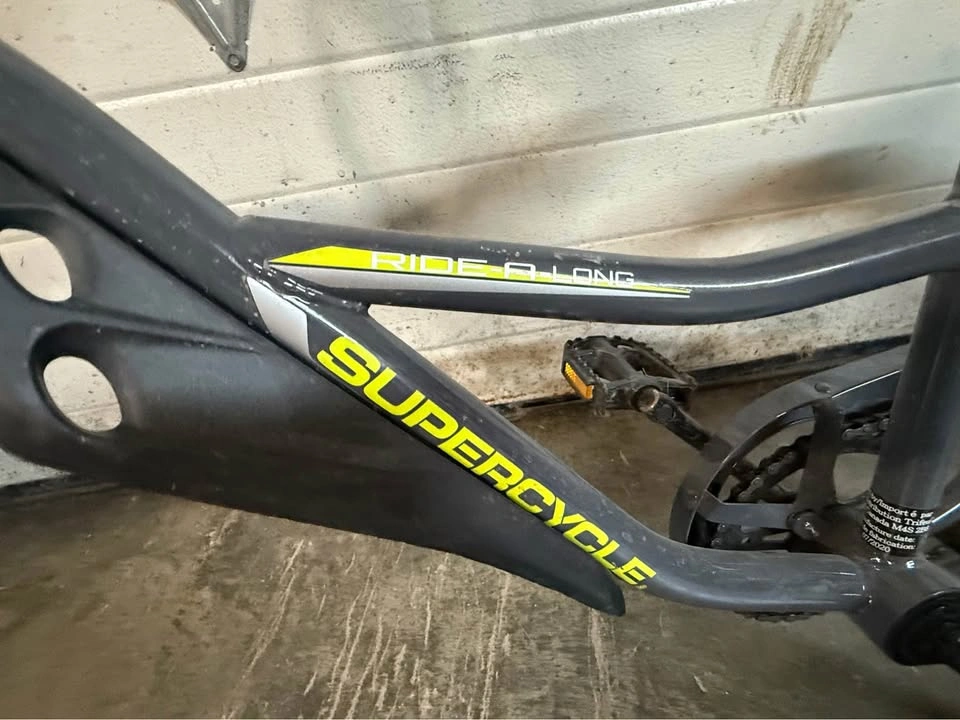 Used trailer bike. Attach to the seat post of any bike. Tire is fairly worn to one side because of child leaning. Still works though. In good condition overall.