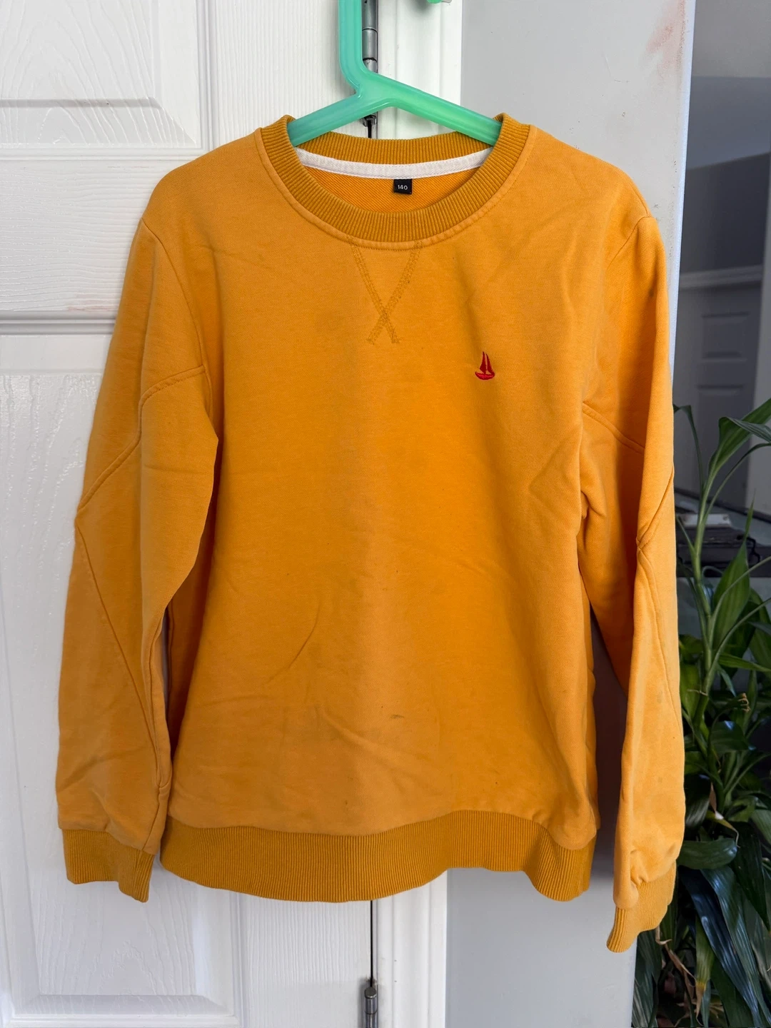 Selling a Nautica crewneck sweatshirt in yellow. It's a size 140. There are some signs of wear, as shown in the photos, but it's still in good condition for everyday wear!