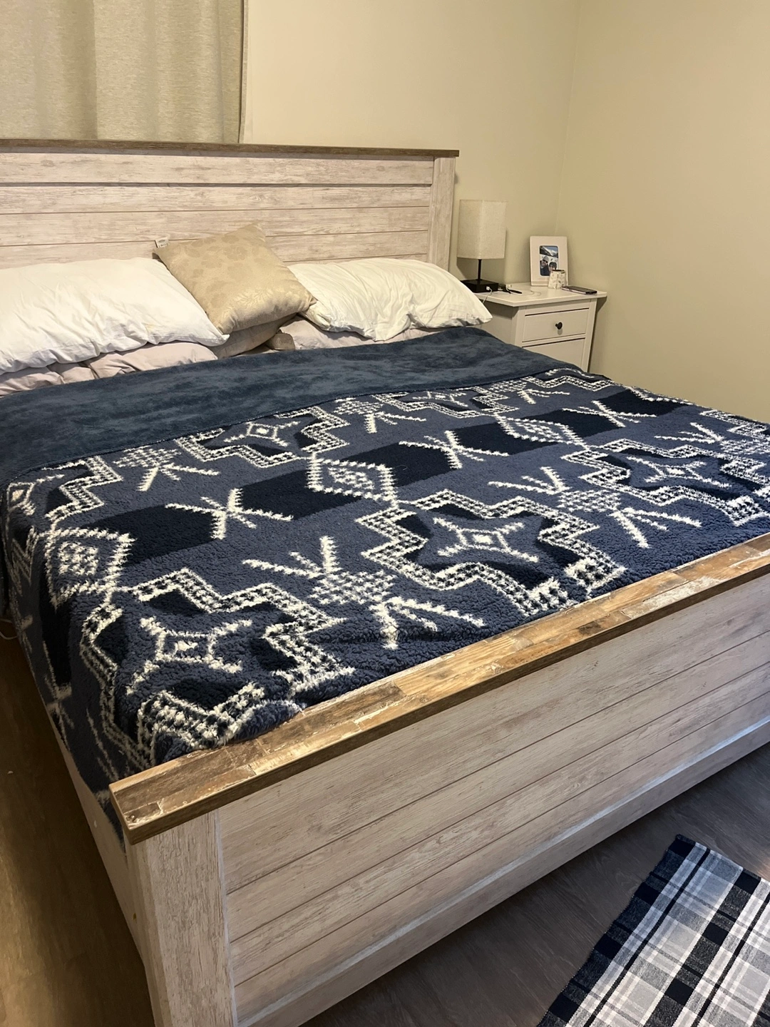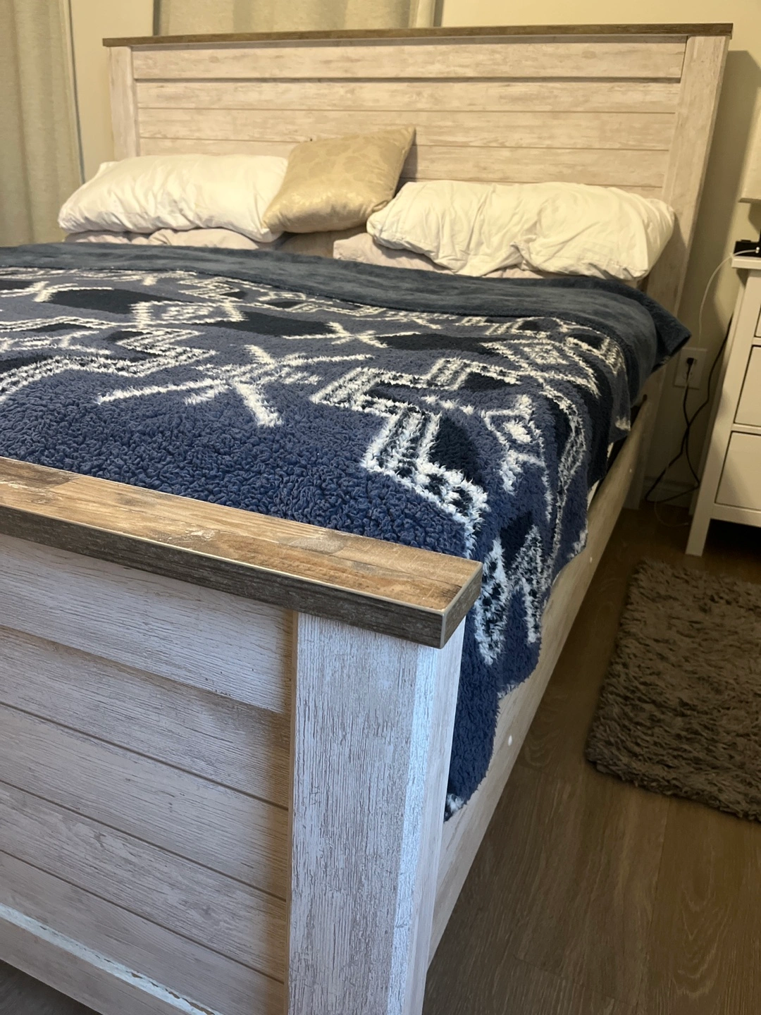 King size bed frame, whitewashed finish. Features a rustic farmhouse design. Solid wood construction. Includes headboard, footboard and side rails. Excellent condition. We are selling our King Size Bed & Mattress and switching for a Queen size to accommodate for baby crib in the bedroom. About this item: Bed is from Ashley - WILLOWTON Nattress is from Sleep Country