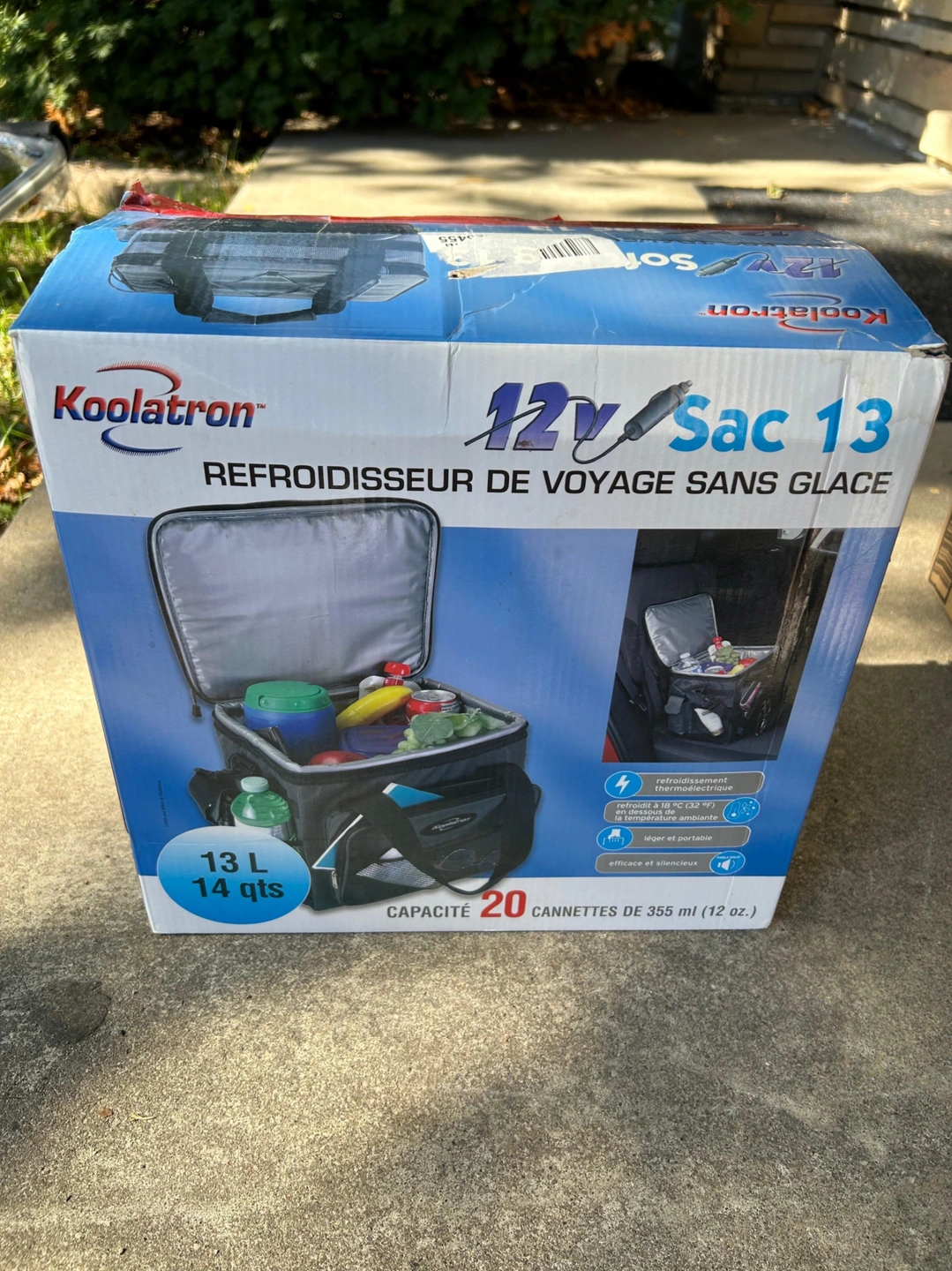 Keep food and drinks cool on the go with the Koolatron 12V Soft-Sided Travel Cooler. This thermoelectric cooler plugs directly into your car’s 12V outlet, so there’s no ice required. Compact and lightweight, it’s perfect for road trips, camping, picnics, or long drives. Key Features: Capacity: 13 L / 14 quarts (holds up to 20 cans) 12V car adapter included – plug into your vehicle’s power outlet Thermoelectric cooling – keeps contents cold without messy ice Lightweight & portable with carry strap Durable soft-sided design with zippered closure Quiet & efficient operation Original price - 95+tax