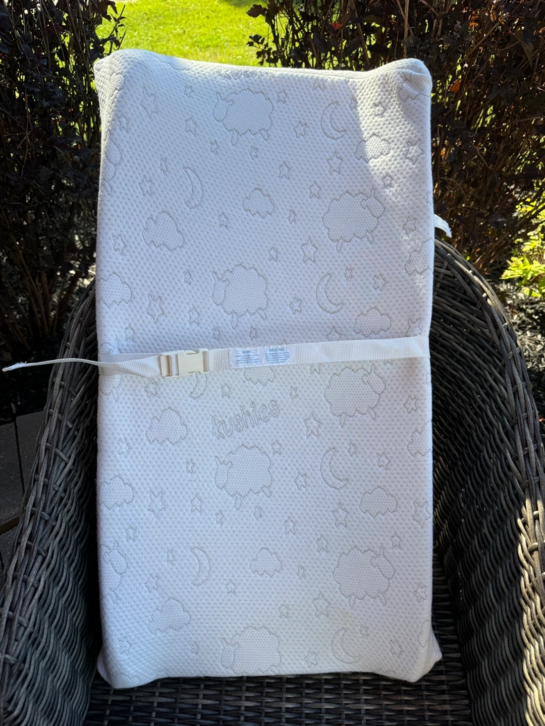 Here's a Kushies baby changing pad! It's in great condition and ready for a new home. The pad features a cute sheep, moon, and star pattern. Perfect for diaper changes! Retails for $69.99 brand new.