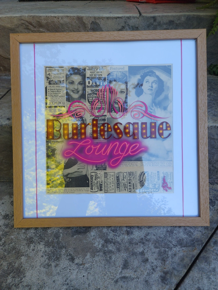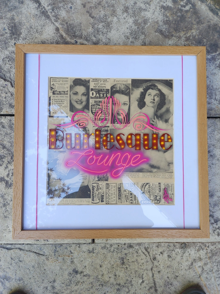 framed real 1950s detroit times newspaper clipping collage with burlesque and pinup model theme. hand painted pinstriping and lettering on top of the glass. measurements in photos.