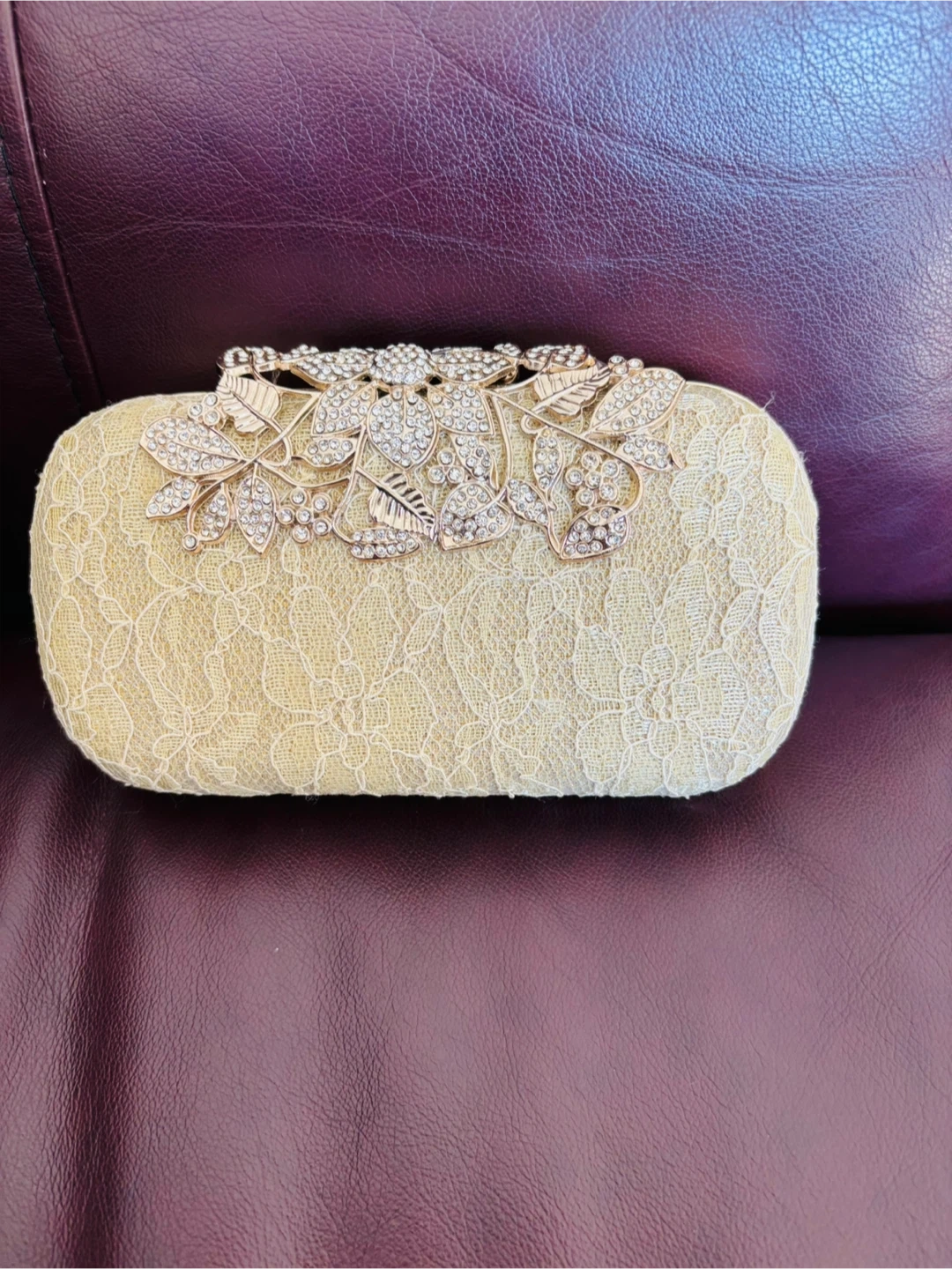 Selling this beautiful lace clutch with rhinestone detailing! It's perfect for a special occasion or to add a touch of elegance to your outfit
