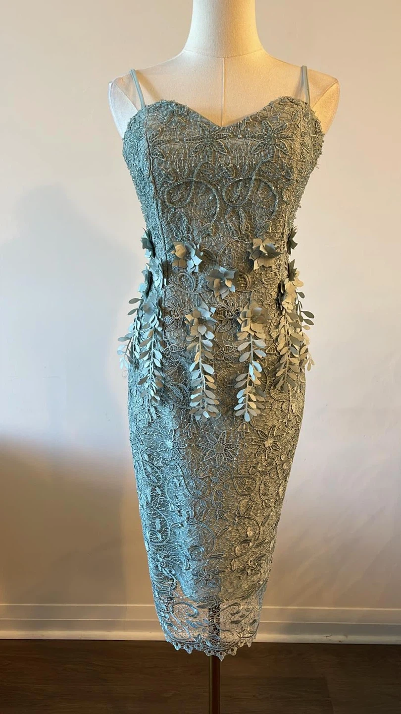 Beautiful lace cocktail dress in a unique silver/blue colour! The dress features delicate floral and leaf detailing, perfect for a special occasion. It's in great condition and ready to wear!