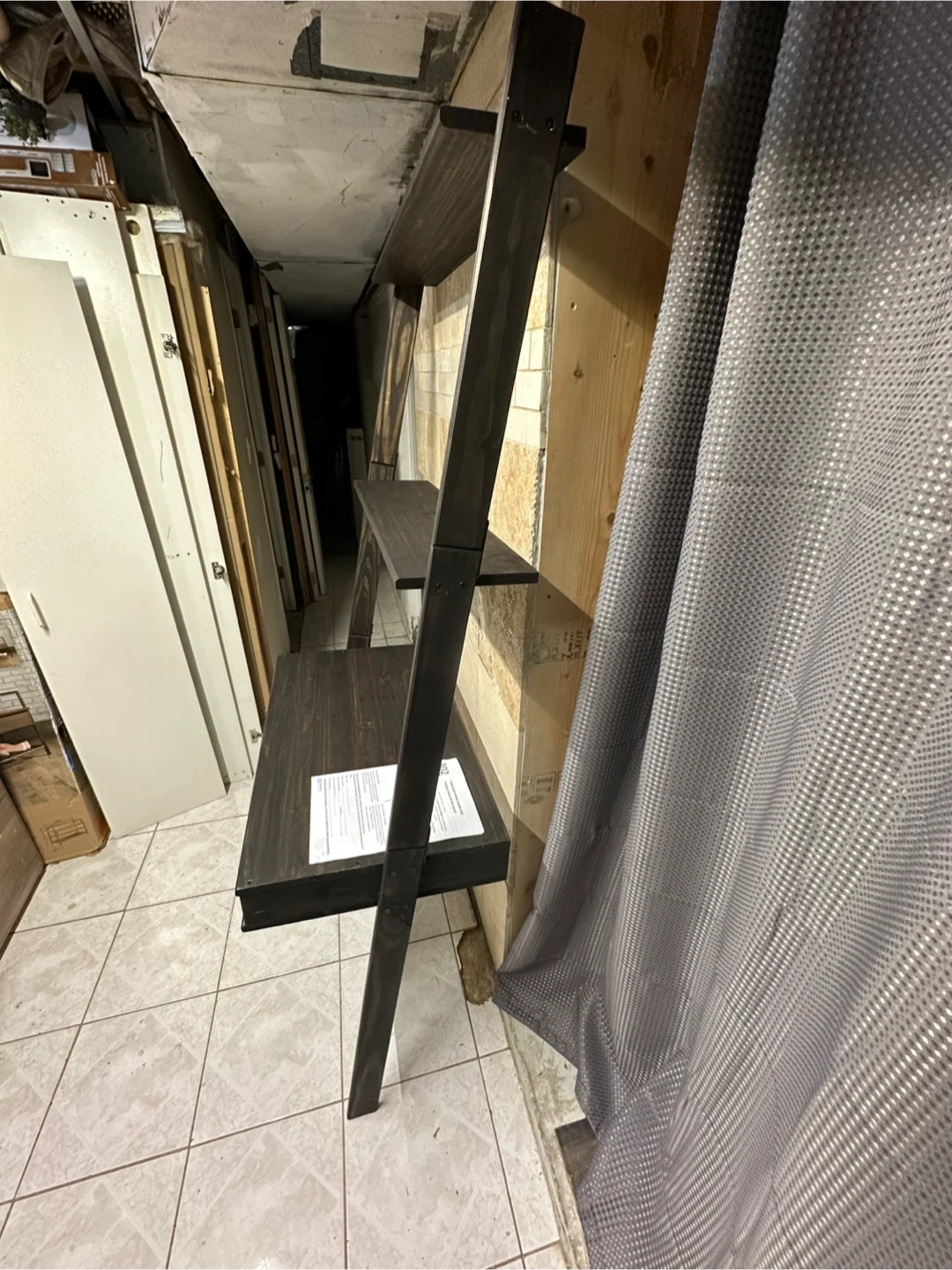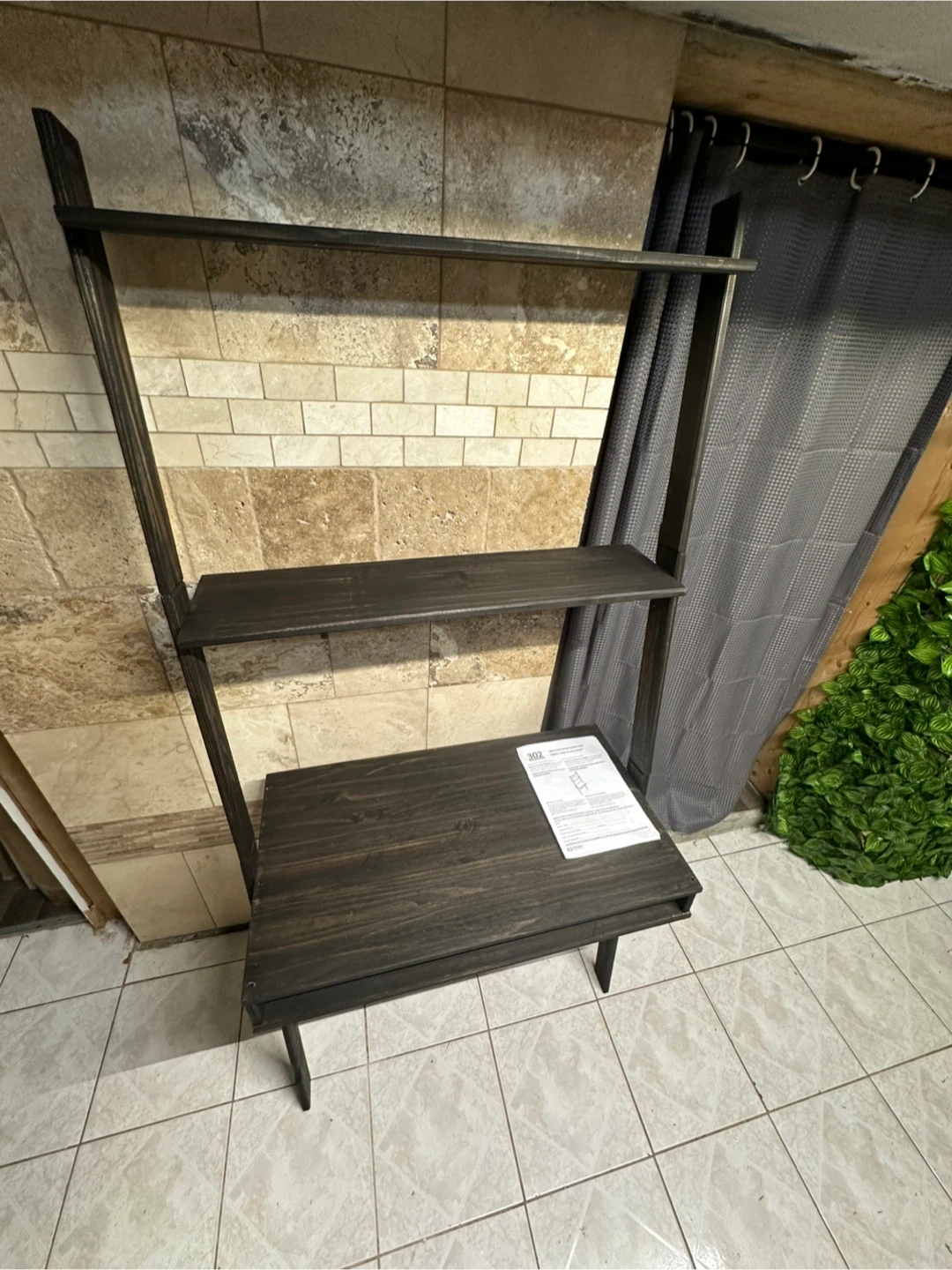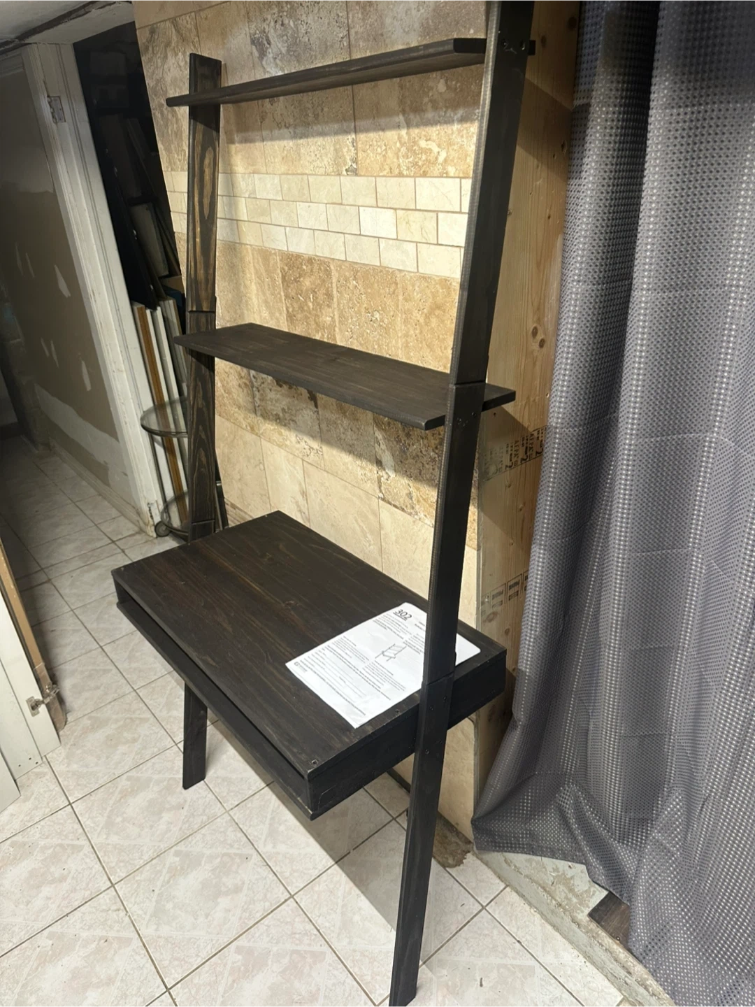 Selling a ladder shelf desk in black, made of natural real wood. 2 open shelves and table top with plenty of storage. Brand new, in original package. It's in great condition and would be perfect for a small space or home office. Width 32 inches Depth 18 inches Height 30 inches desk top Total height 70 inches
