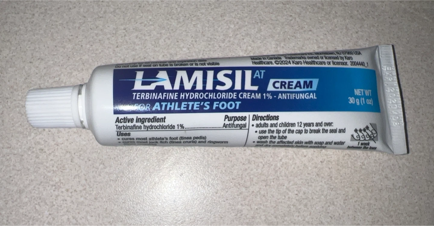 Selling a tube of Lamisil AT Cream, perfect for treating athlete's foot. Contains Terbinafine hydrochloride 1% as the active ingredient. It's an antifungal cream designed to cure most athlete's foot (tinea pedis), jock itch (tinea cruris), and ringworm. Net weight is 30 g (1 oz).