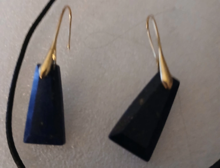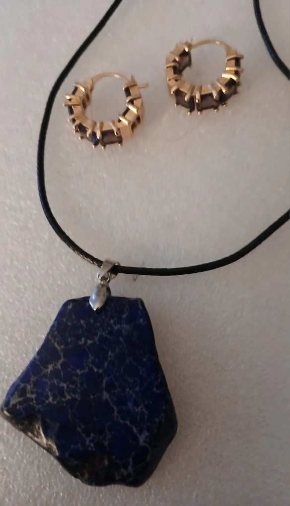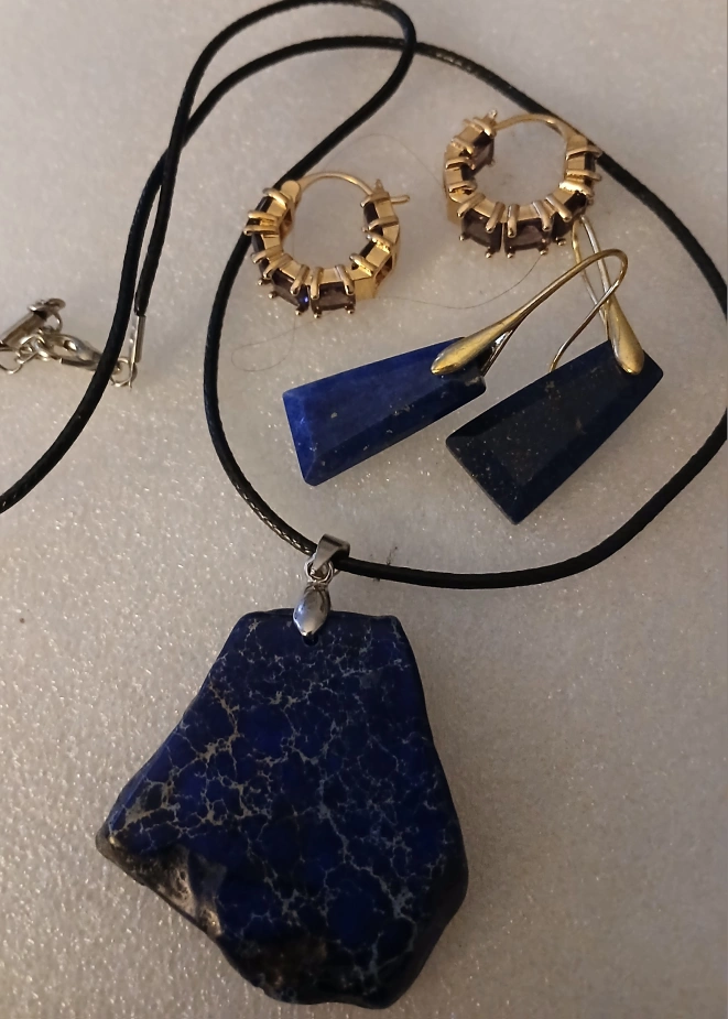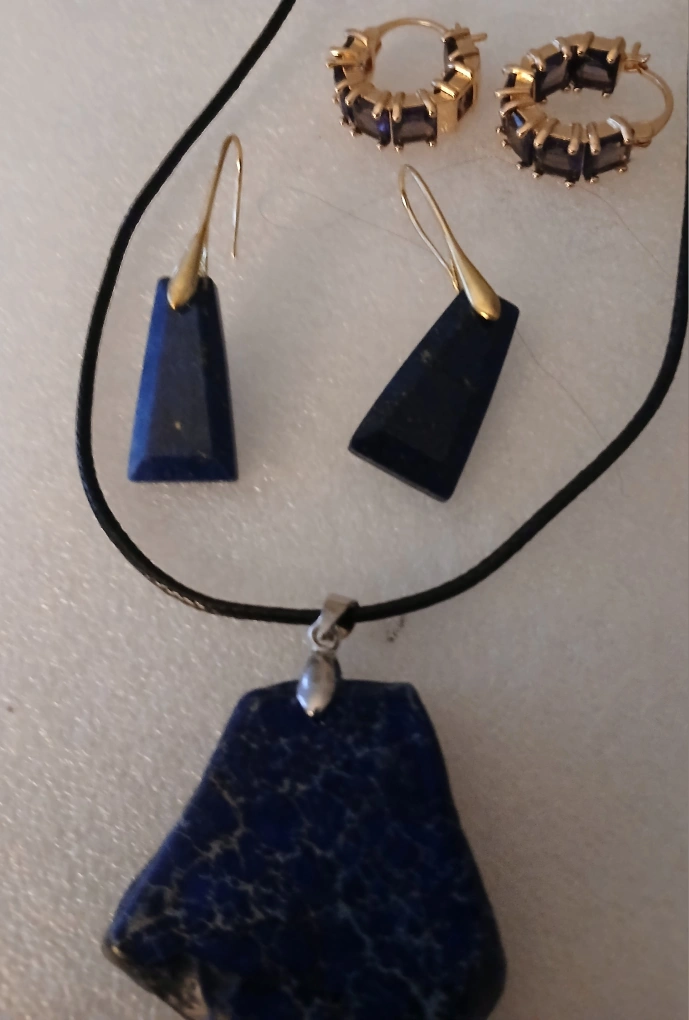 Here's a beautiful set featuring a lapis lazuli pendant necklace and matching earrings! The deep blue colour of the lapis is really striking, and the gold accents on the earrings add a touch of elegance. add on another pair of small hoops