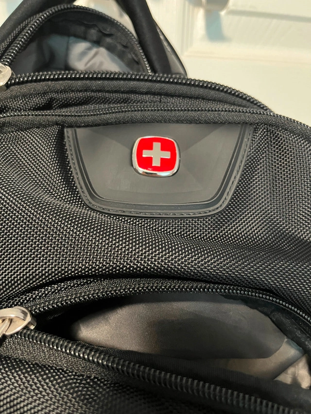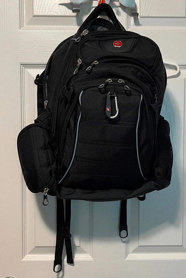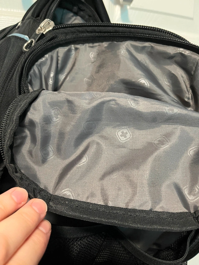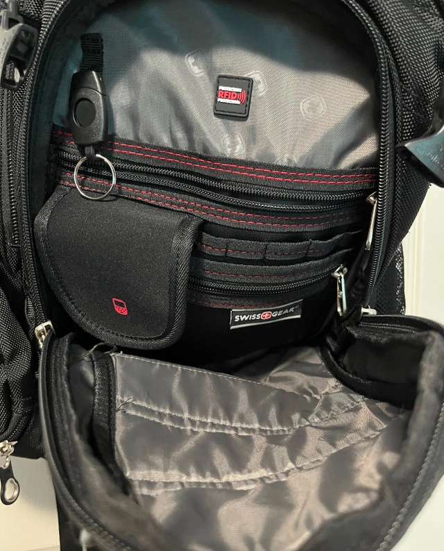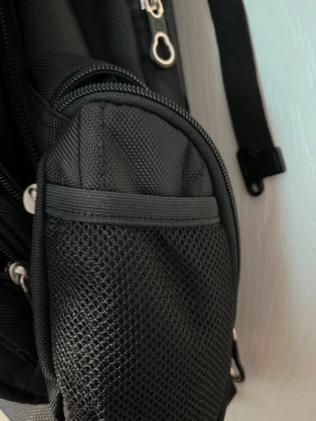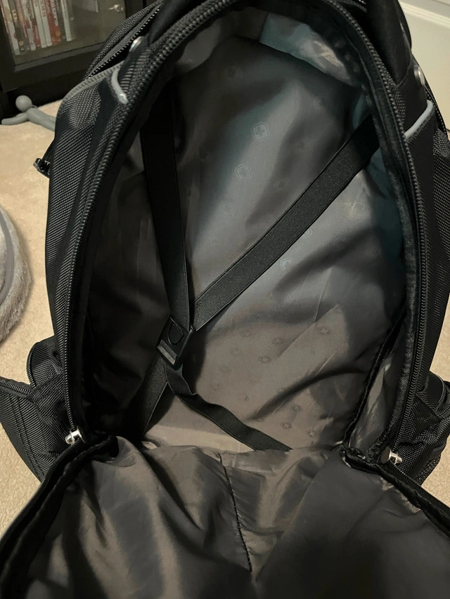 Sleek black design with multiple compartments. Ideal for organization and comfort. Durable and stylish for everyday use, travelling, or going into the office. Water resistant laptop bag with RFID protection. Roomy backpack with lots of zippered areas and pockets (around 22) for laptop, tablet, pens, and everything you need on the go. Opening to slip it onto your luggage handles. Strap across front for support. Straps to cinch it to be more compact. Sturdy. Excellent condition, used maybe once a week for a little over a year. $60. Near the Burlington/Oakville border.