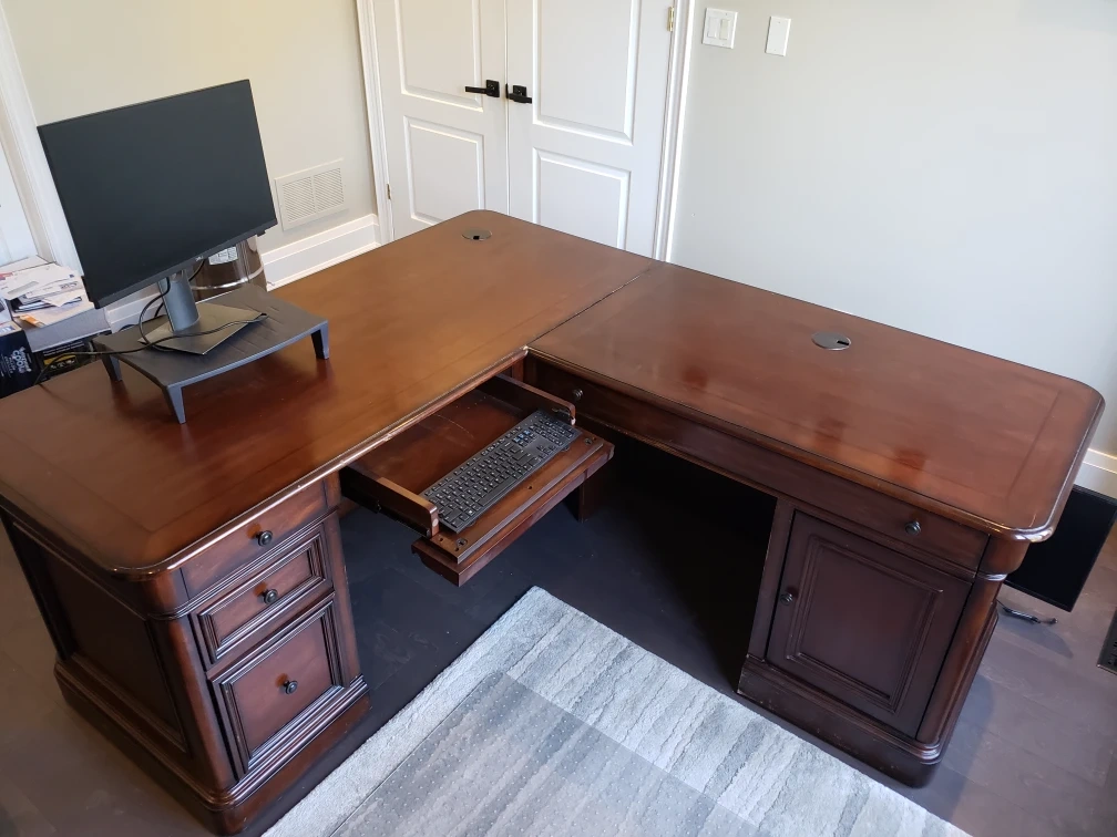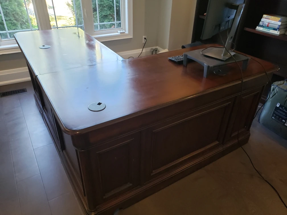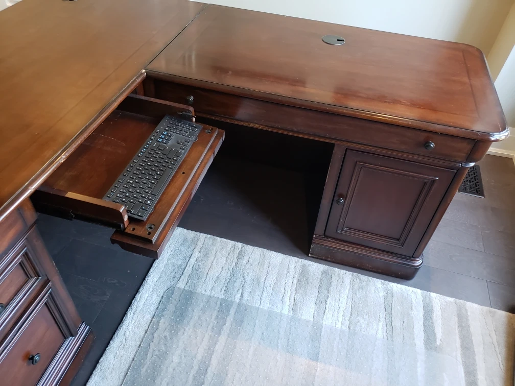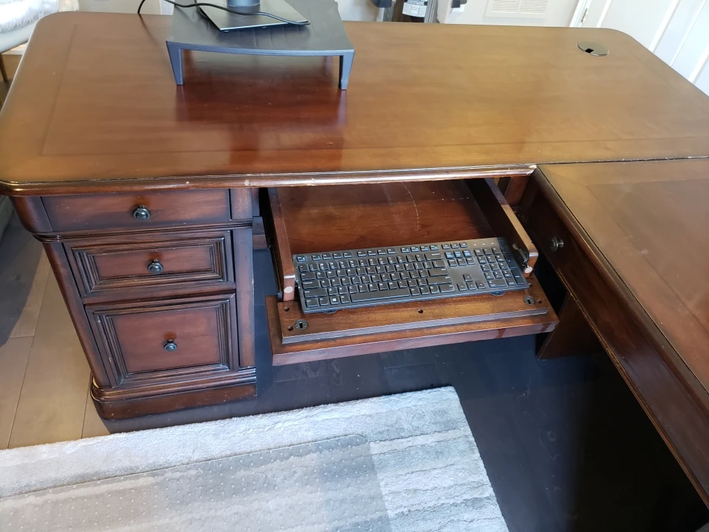 Selling a large, executive L-shaped wooden desk. It features a rich, dark wood finish and plenty of workspace. It also includes drawers and a pull-out keyboard tray for added convenience. Perfect for a home office or professional setting!