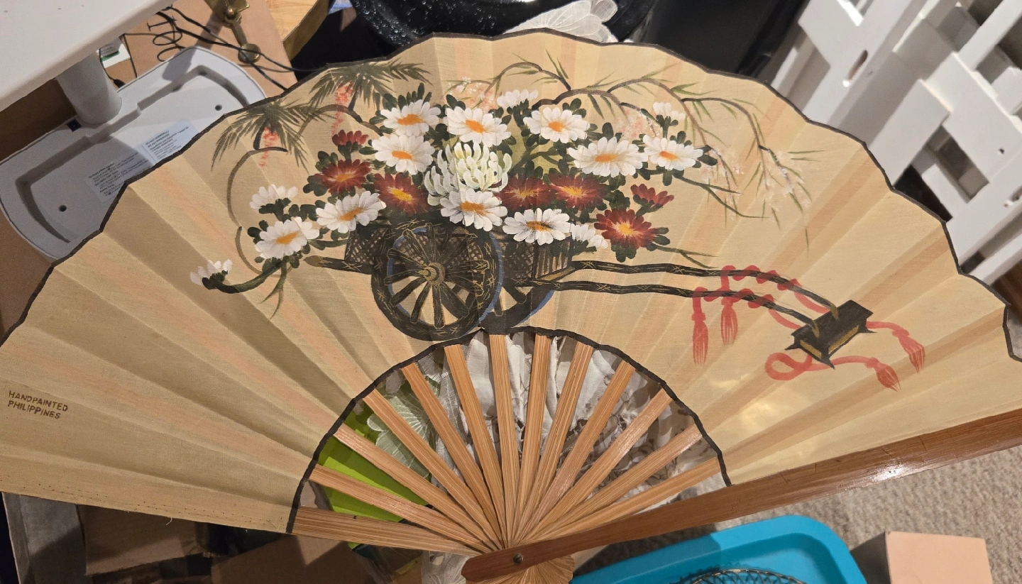 Selling a lovely handpainted fan from the Philippines. It features a beautiful floral design with a cart. Perfect for decoration in your living space