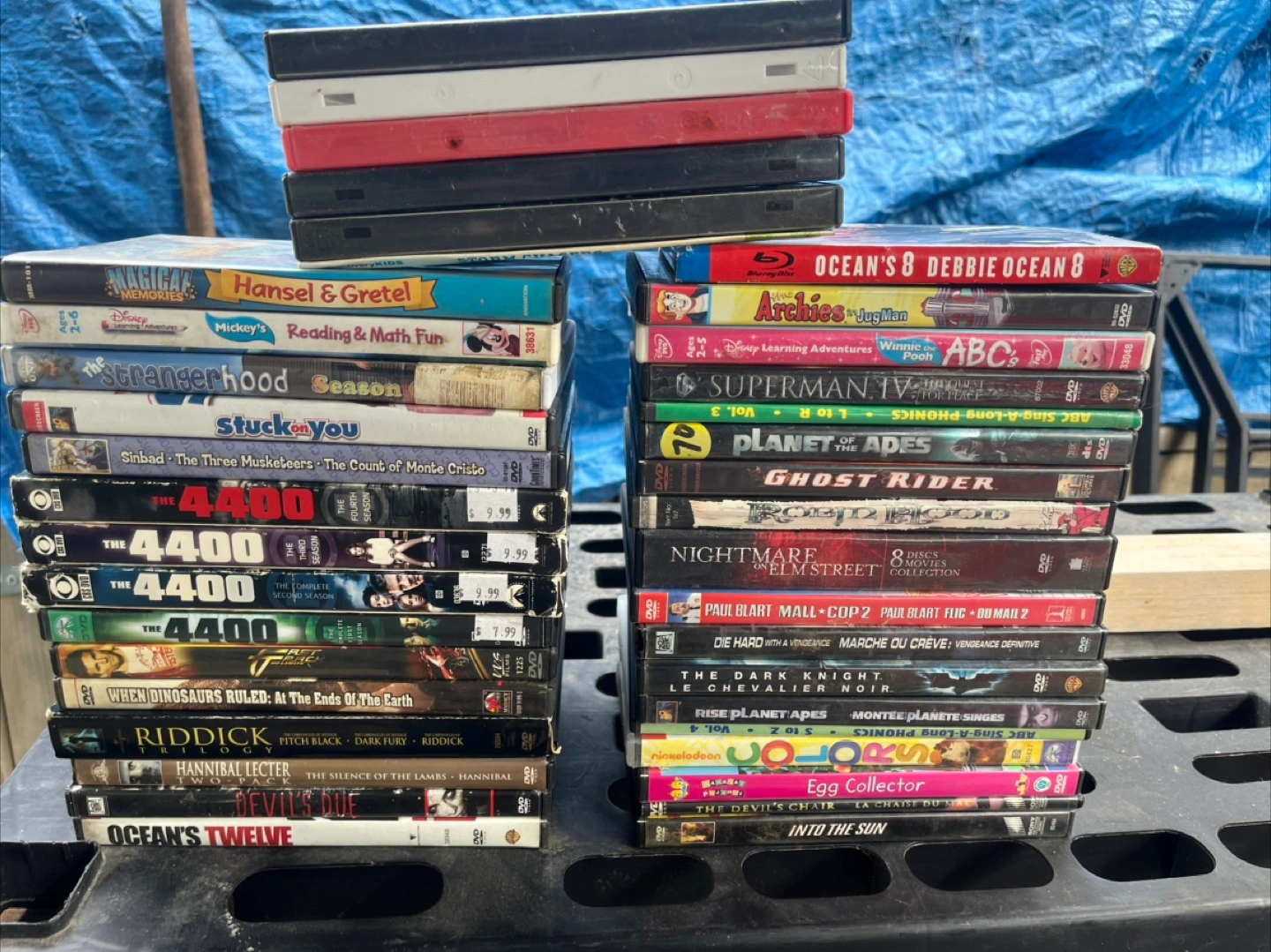 Huge collection of DVDs. Variety of genres including family, action, and more. Titles include Ocean's 8, The 4400, Nightmare on Elm Street, and many others. Great for movie nights! 39 DVD’s