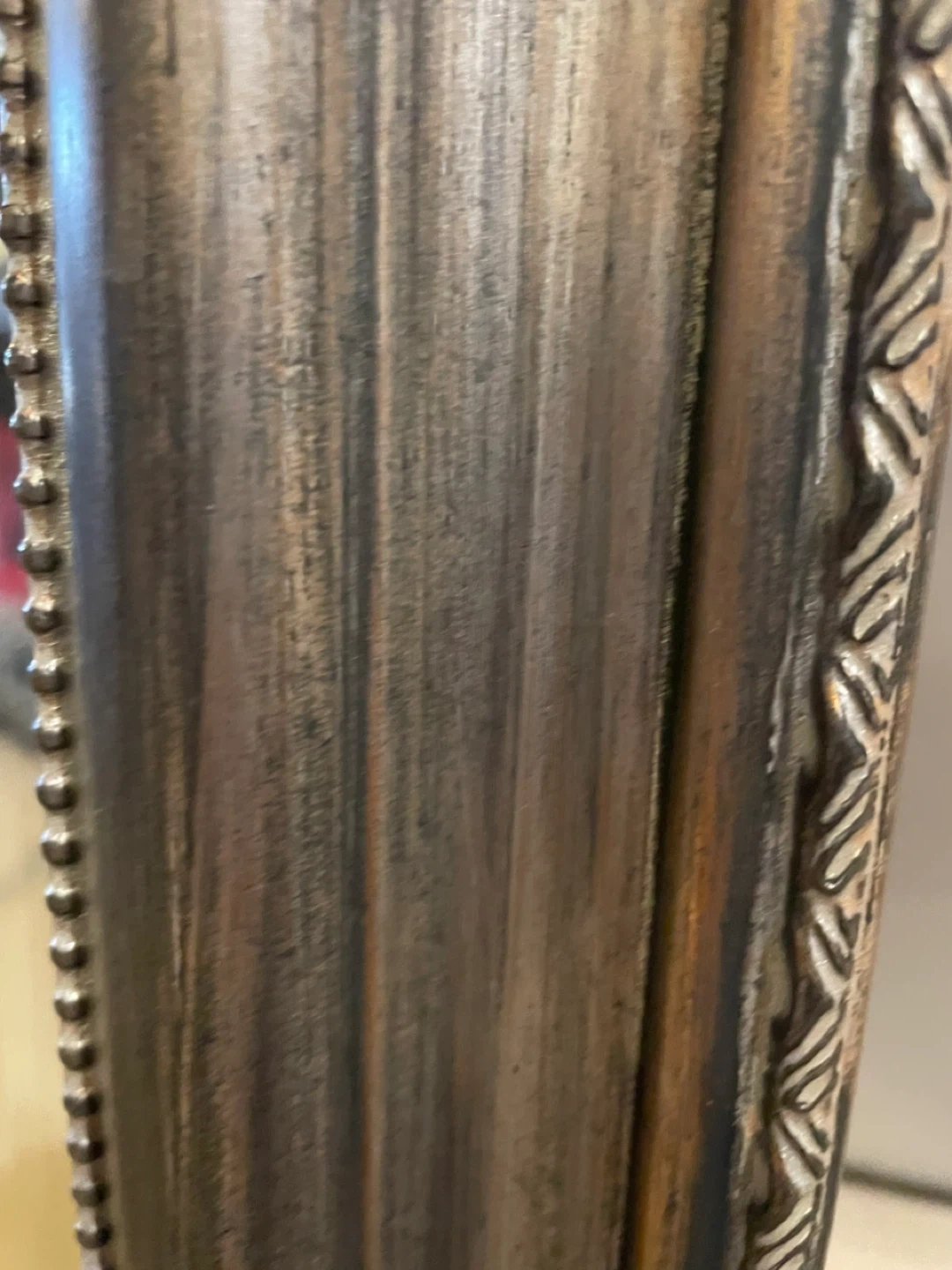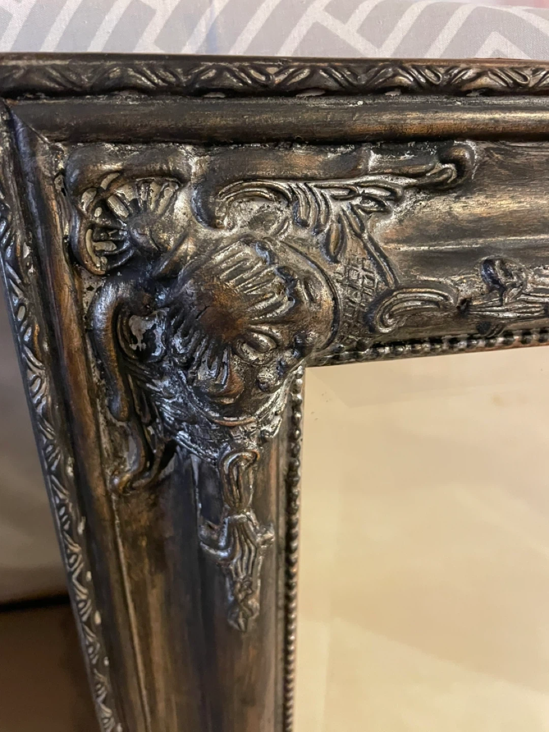 Selling a large framed mirror with a beautiful ornate design. The frame has a dark, antiqued finish. It measures approximately 35.5 inches by 45.5 inches. Perfect for adding a touch of elegance to any room!