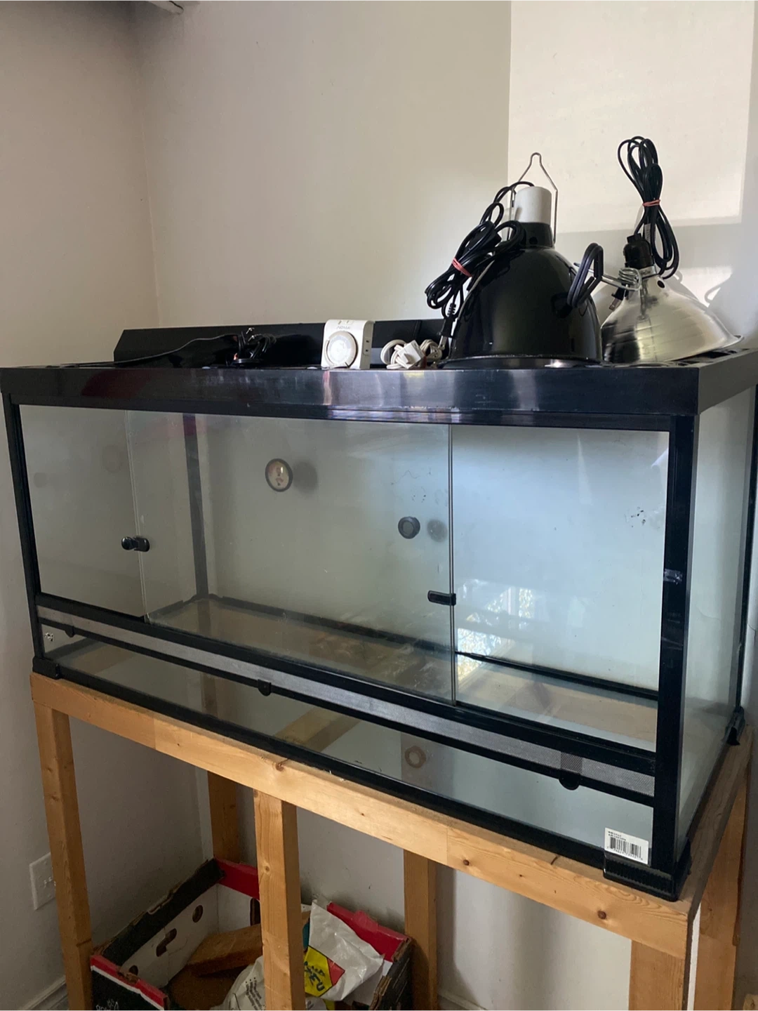 Selling a large (90gal) reptile terrarium that's ready for a new home! It comes with several accessories to help create the perfect environment for your scaly friend. Included are heat lamps and a timer to regulate the temperature. It's in great condition and ready to use. Price is negotiable.