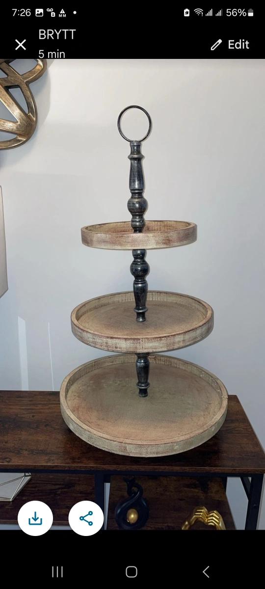 Rustic farmhouse style. Three round tiers. Dark grey metal stand. Perfect for parties or displaying items. I have very little counter space so I used It on my counter top for spices, sugar bowl, coffee, tea, canisters, salt & pepper shakers small plants etc... From a clean smoke free home 30 inches tall Bottom tray 16 inches wide Middle tray 13 inches wide Top tray 10 inches wide ****CASH ONLY**** CROSS POSTED Asking $25