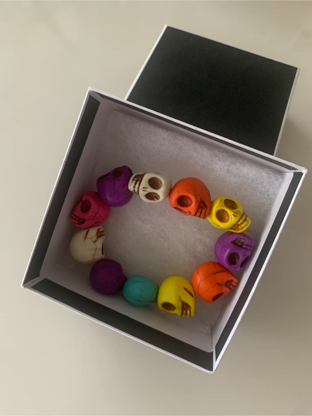 Happy Halloween! π Fun and funky skull bead bracelet! It features a variety of colourful skull beads. Comes in a box, perfect for gifting or storage.