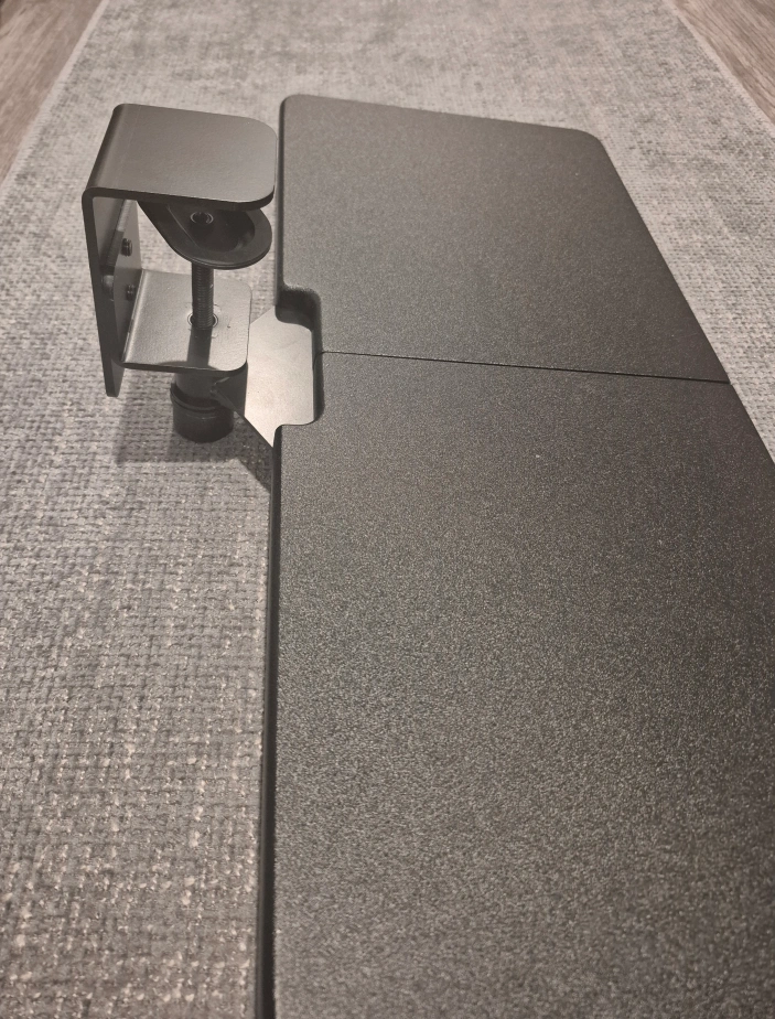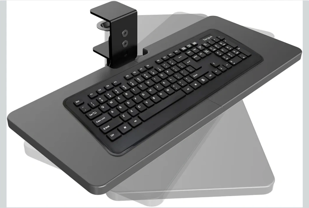 360° rotatable computer tray. Extra sturdy desk swivel clamp. Easy attachment to your desk. New open box. When not in use, the tray can be rotated under the desktop.
