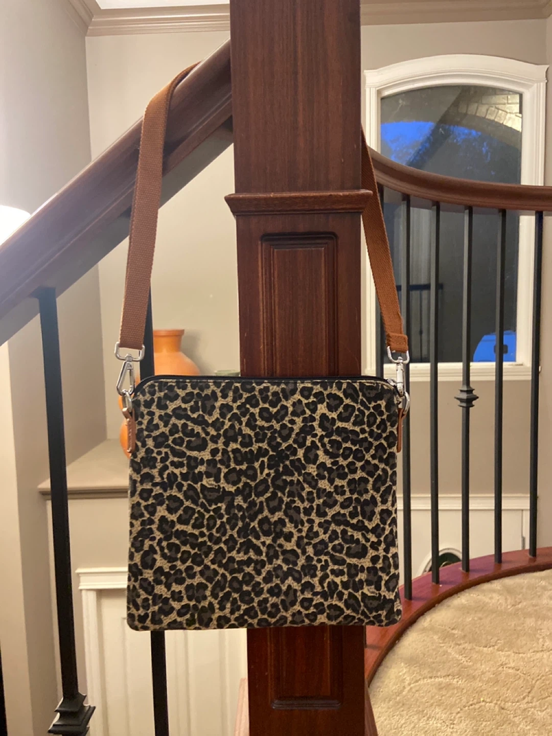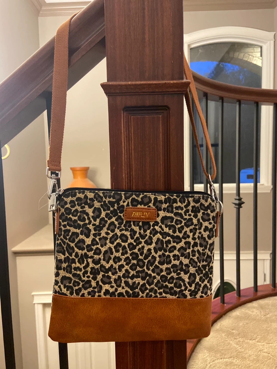 Looking to sell this stylish LBFLV crossbody bag! It features a fun leopard print design with a brown accent at the bottom. The inside has a neutral-toned lining with a zippered pocket and additional compartments for organization. Perfect for adding a bit of flair to your outfit