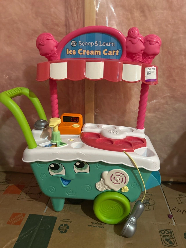 This is a LeapFrog Scoop & Learn Ice Cream Cart, a fun and educational toy for kids! It is in used condition, ready to provide hours of fun and learning. Key features include: * Interactive play with sounds and phrases * Teaches counting, colors, and flavors * Includes various ice cream scoops and toppings * Encourages imaginative play and creativity This ice cream cart is ready for a new home. It's in good condition and looking for its next ice cream adventure! If you're reading this, the ice cream cart is available. Let me know if you're interested!
