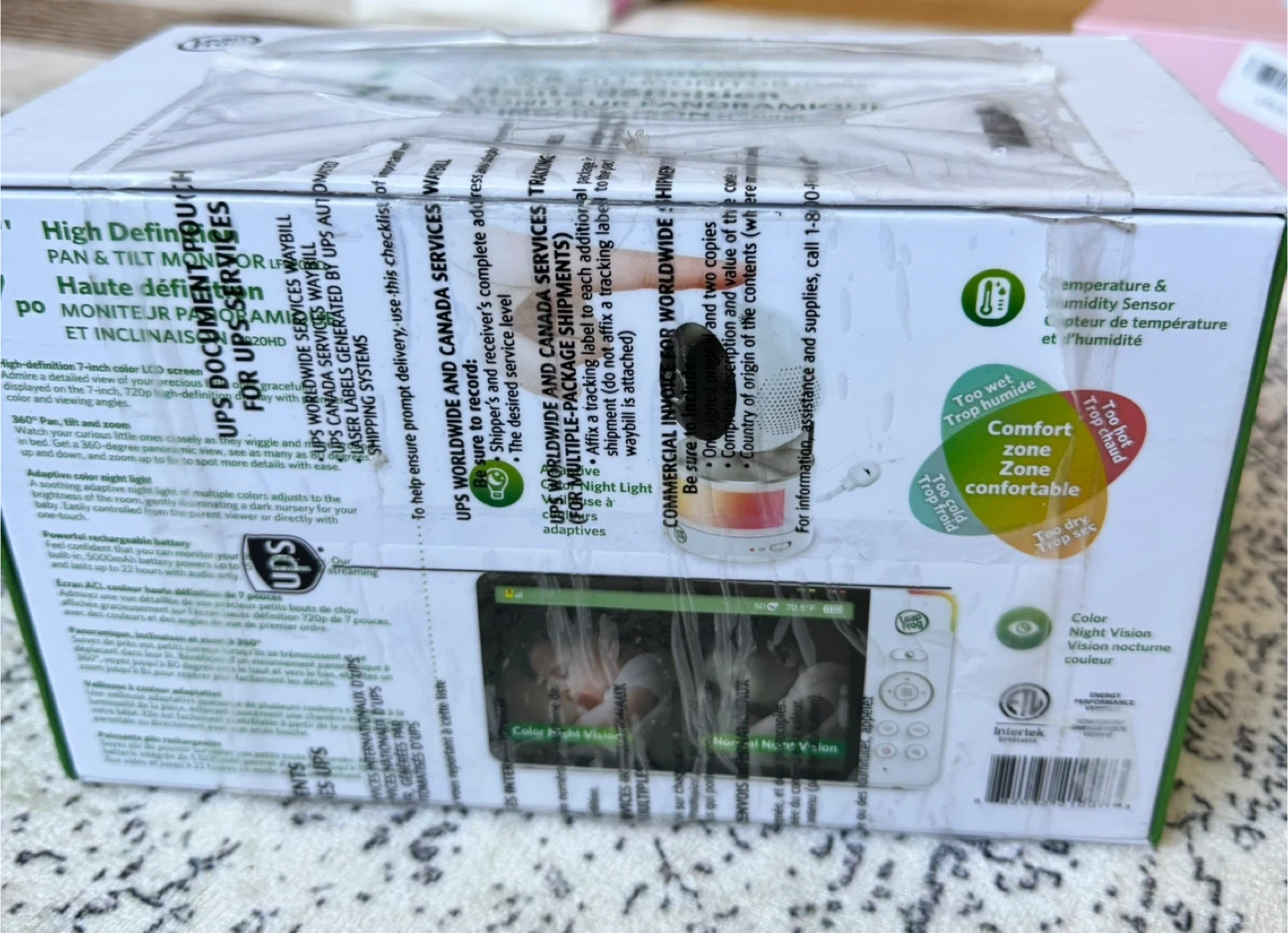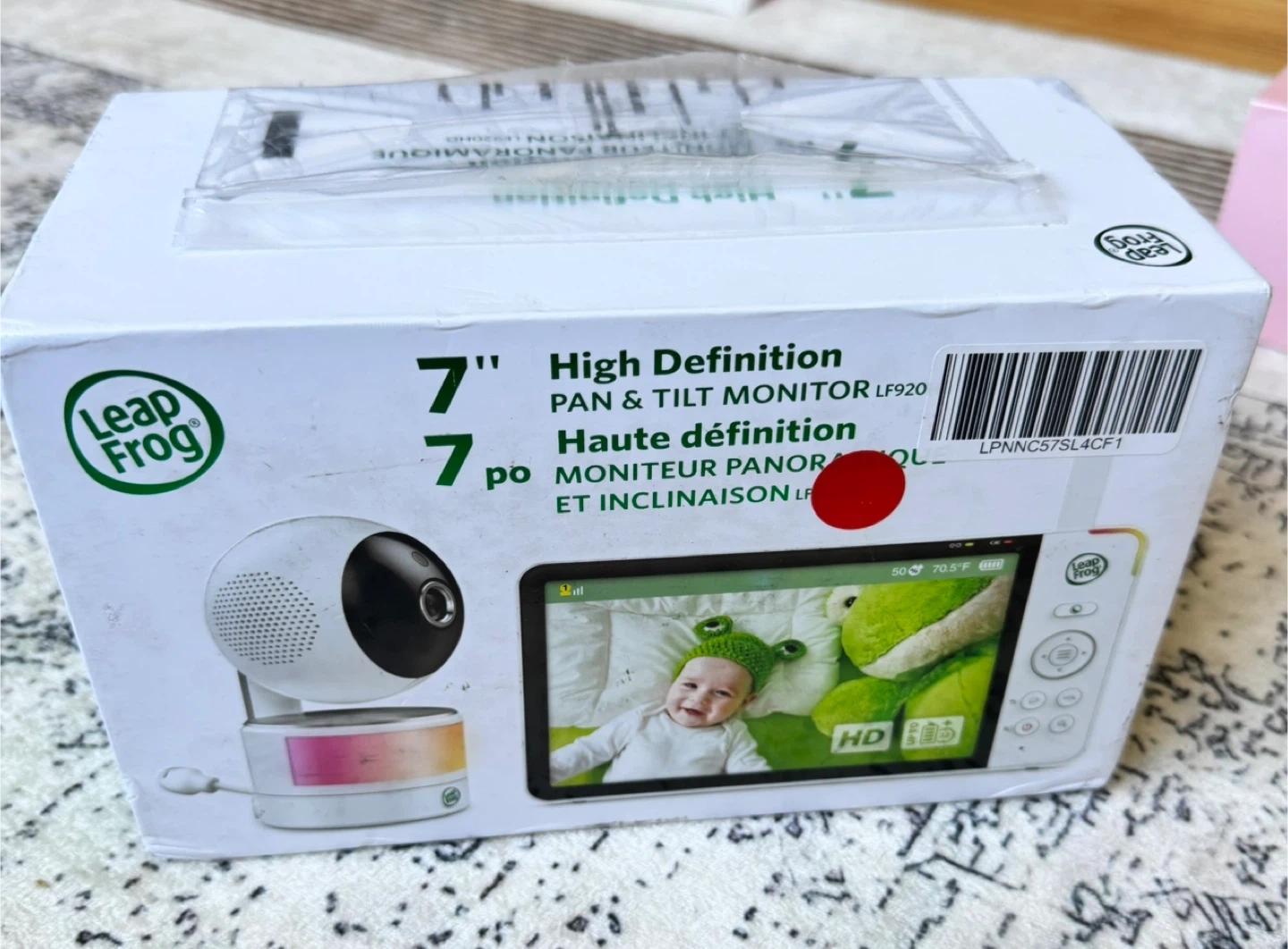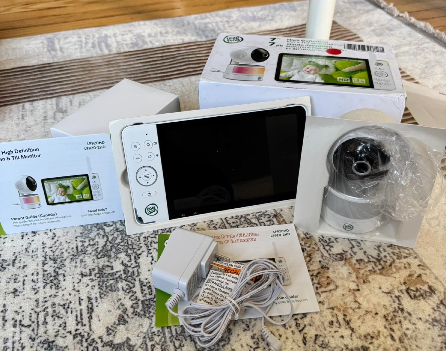 Selling a LeapFrog 7" high-definition pan and tilt baby monitor (model LF920). It comes with the box and all original components, including the camera, monitor, and power adapter. This monitor lets you keep an eye on your little one with clear video and remote pan, tilt, and zoom features. The monitor also displays temperature and humidity readings