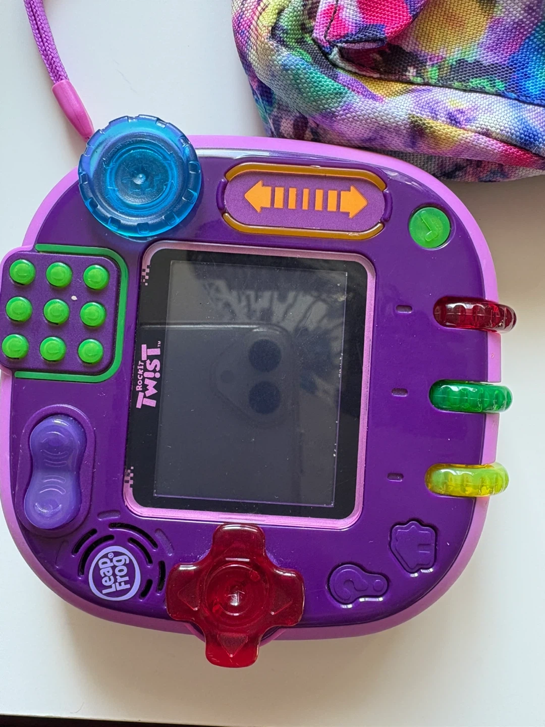 Selling a LeapFrog RockIt Twist handheld game in purple, along with a colourful kids' backpack. The RockIt Twist is a fun and educational toy for kids, and the backpack is perfect for carrying small items. Both items are in good condition!