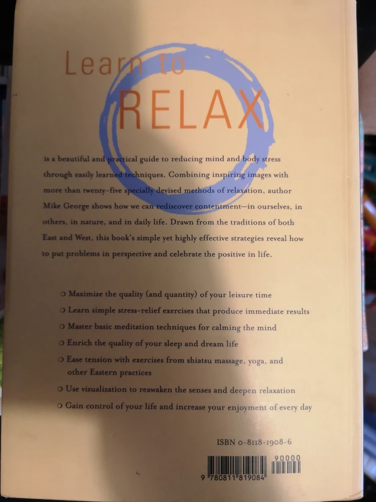 Selling a copy of 'Learn to Relax: A Practical Guide to Easing Tension & Conquering Stress' by Mike George It's a beautiful and practical guide to reducing mind and body stress through easily learned techniques. Combining inspiring images with more than twenty-five specially devised methods of relaxation, author Mike George shows how we can rediscover contentment—in ourselves, in others, in nature, and in daily life