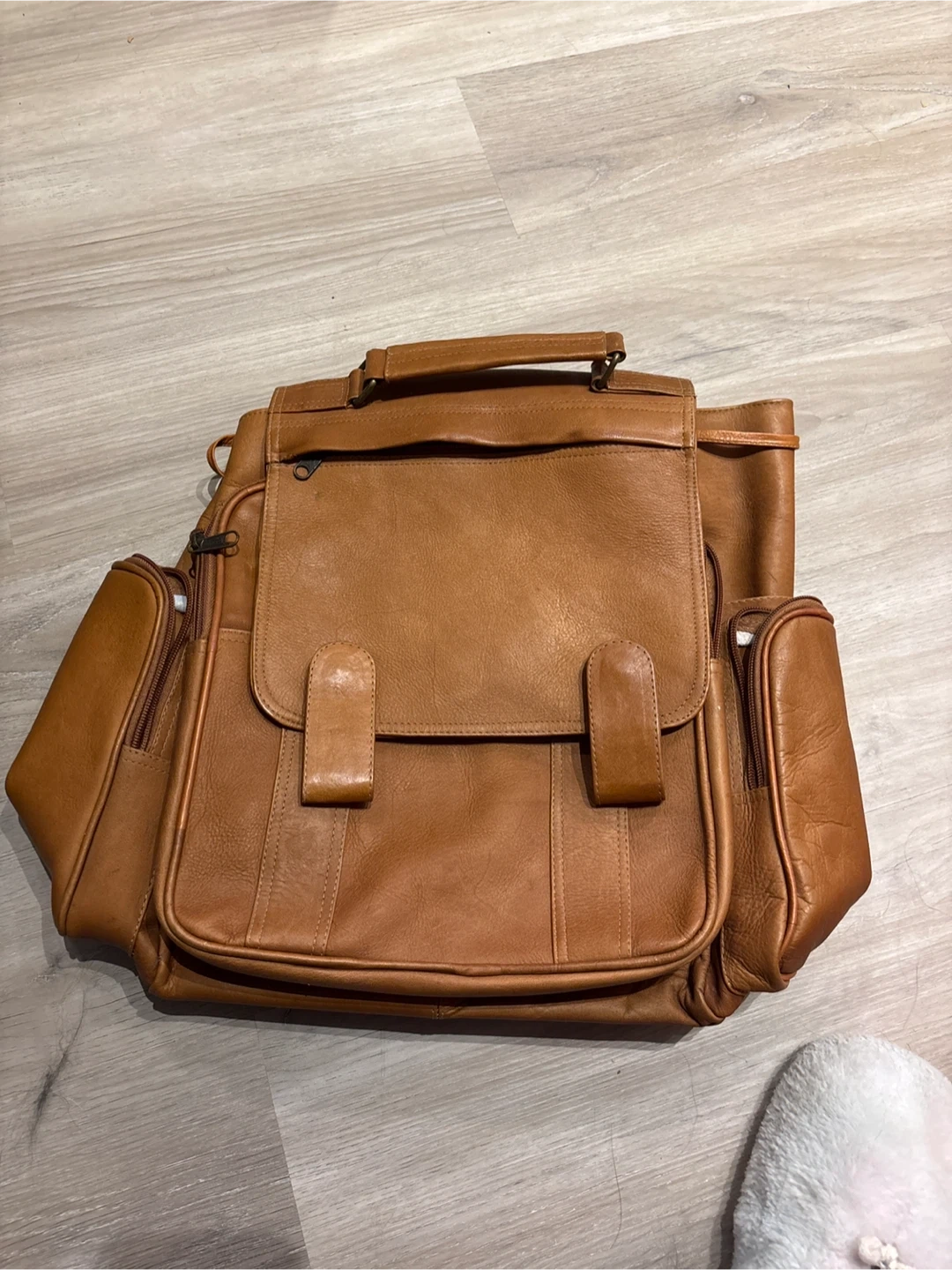 Beautiful genuine leather backpack big pouch holds laptop and books. Front pouch for tools, snacks, notebooks. Zipper pouches on both sides hold water bottles, keys. Pens, etc. perfect to keep your items dry in any weather. Comfortable straps. Secure, comfortable full leather. Be ready for classes by being organized.