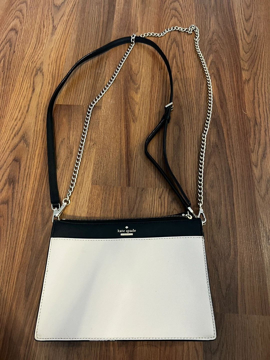 Selling a Kate Spade crossbody bag in a stylish black and beige colour combination. Retail: $225 Features removable chain and leather straps. Great for keeping your essentials organized while on the go. Tags: leather bag, Kate spade, everyday purse, fall, seasonal, black and beige colour, minimalist, contemporary, business casual