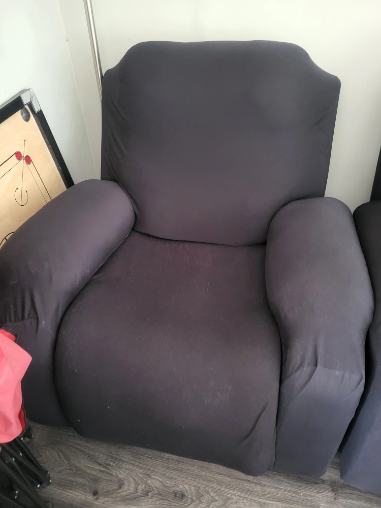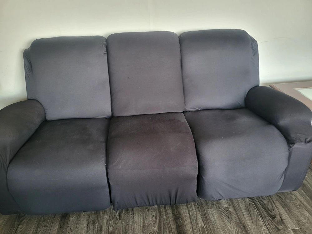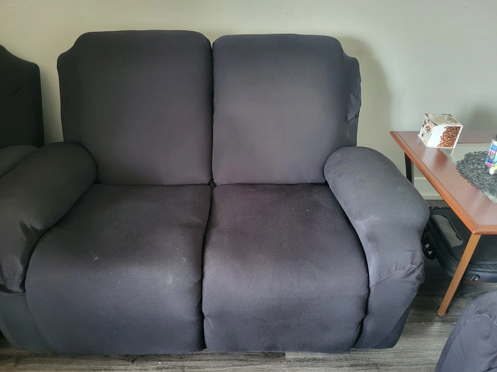 Selling a reclining leather sofa set . It includes a three-seater sofa, a two-seater sofa, and a single armchair. Great for a living room or entertainment area! Comes with a black cloth covering. (the leather is dark brown and worn off a bit)
