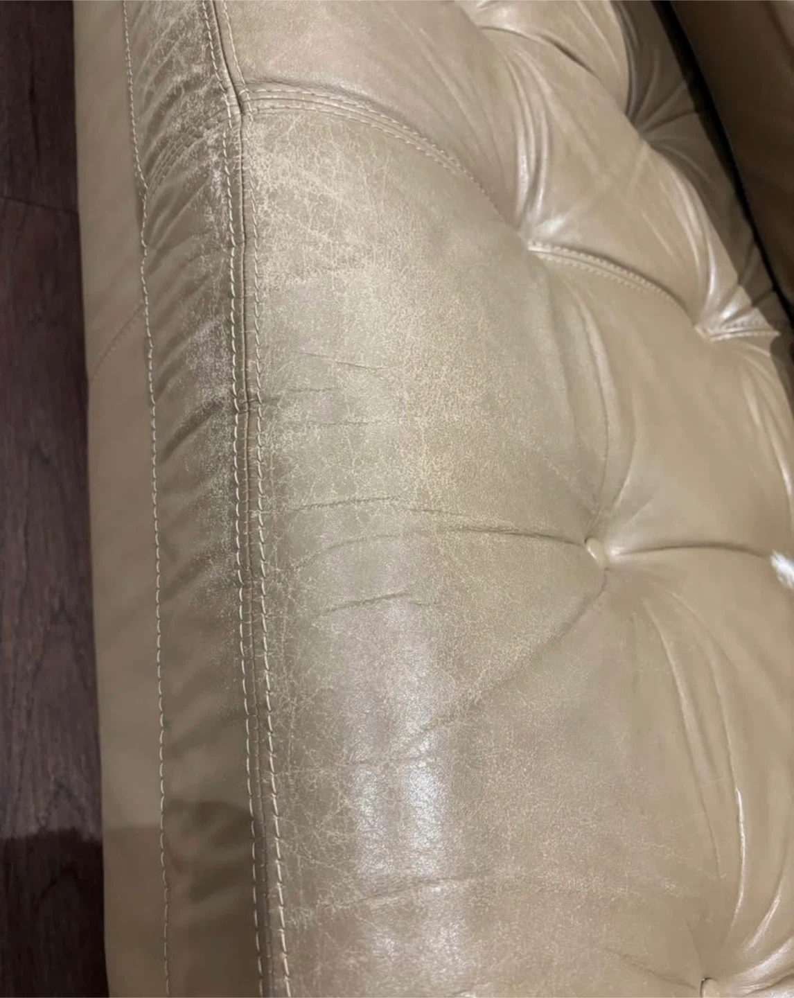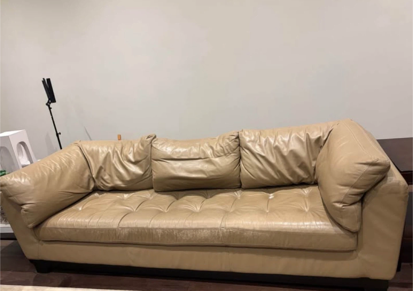 Selling a comfy genuine leather sofa in a neutral taupe colour. Leather has some wear but structurally it is in excellent shape -made in Canada. It's a great addition to any living room. The sofa has a classic tufted design and with cushions (zipped onto back). Perfect for relaxing after a long day!