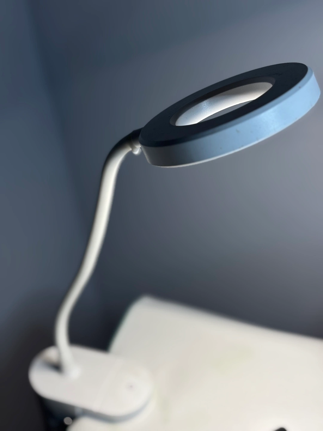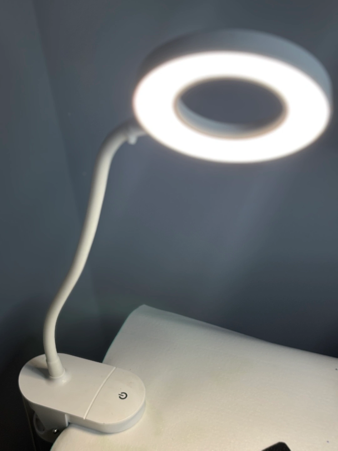 Here's a handy LED desk lamp with a clip! It's perfect for a desk, bedside table, or anywhere you need a little extra light. The lamp is white and in great condition. It provides a nice, focused light that's easy on the eyes