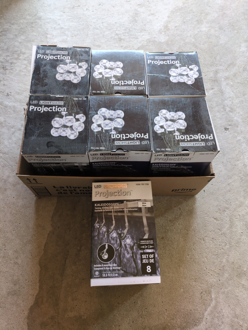 Get ready to light up your space with this set of 8 LED Lightshow Kaleidoscope Projection lights! These turning, swirling light strings are perfect for adding a touch of magic to any room. Includes mounting clips, and each string is 10.5 ft/3.2 m long $50 for 6 boxes