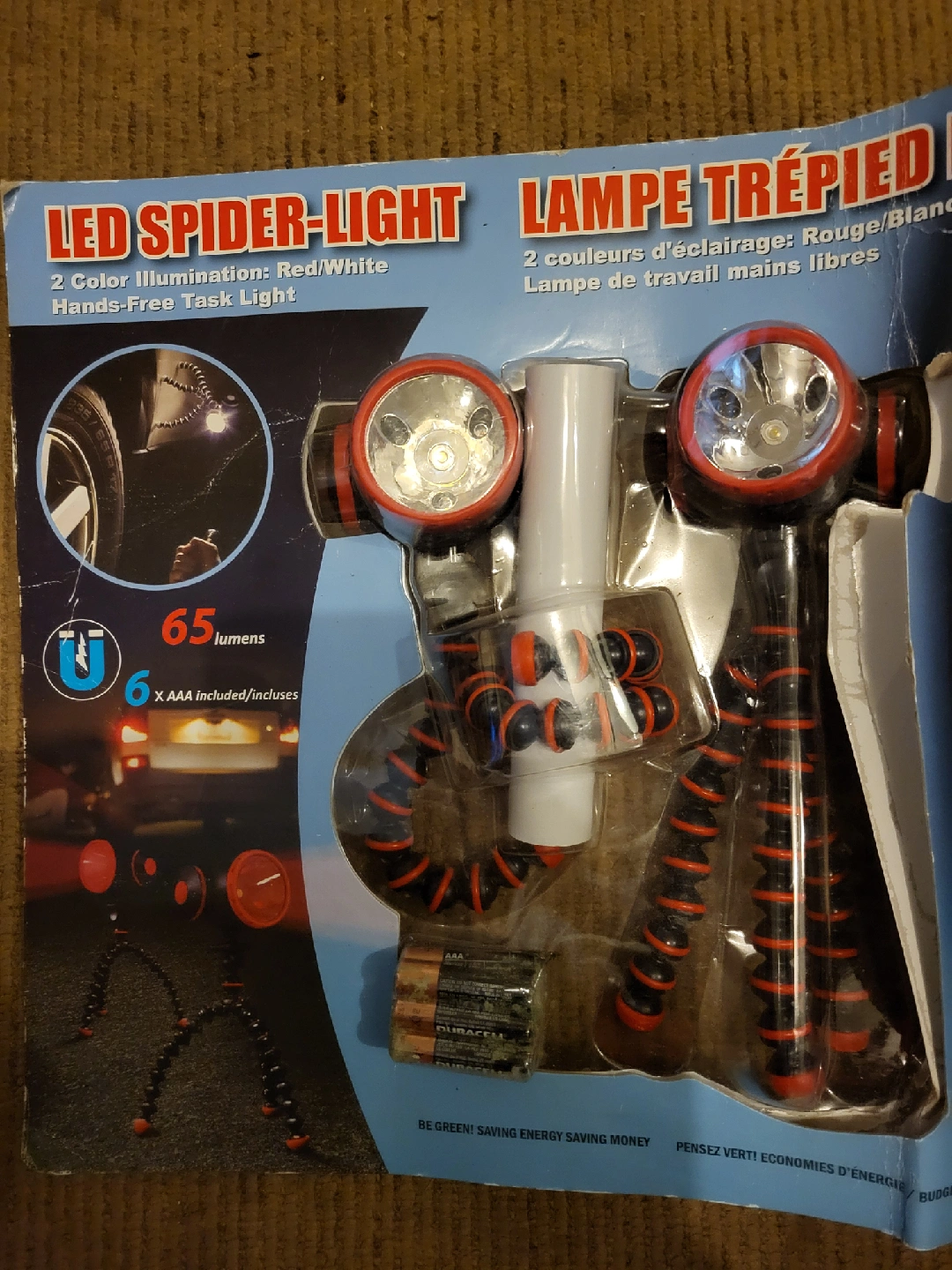 Selling a new LED Spider-Light, perfect for hands-free tasks! It features red and white colour illumination and includes 6 AAA batteries. Be green and save energy!