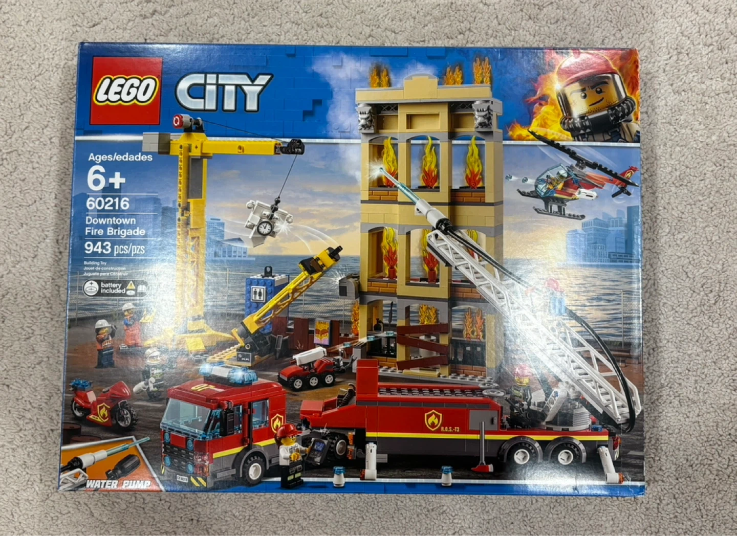 Lego City Downtown Fire Brigade set. Item was previously assembled but repackaged. Uses original box, includes all pieces, numbered bags, and instructions.