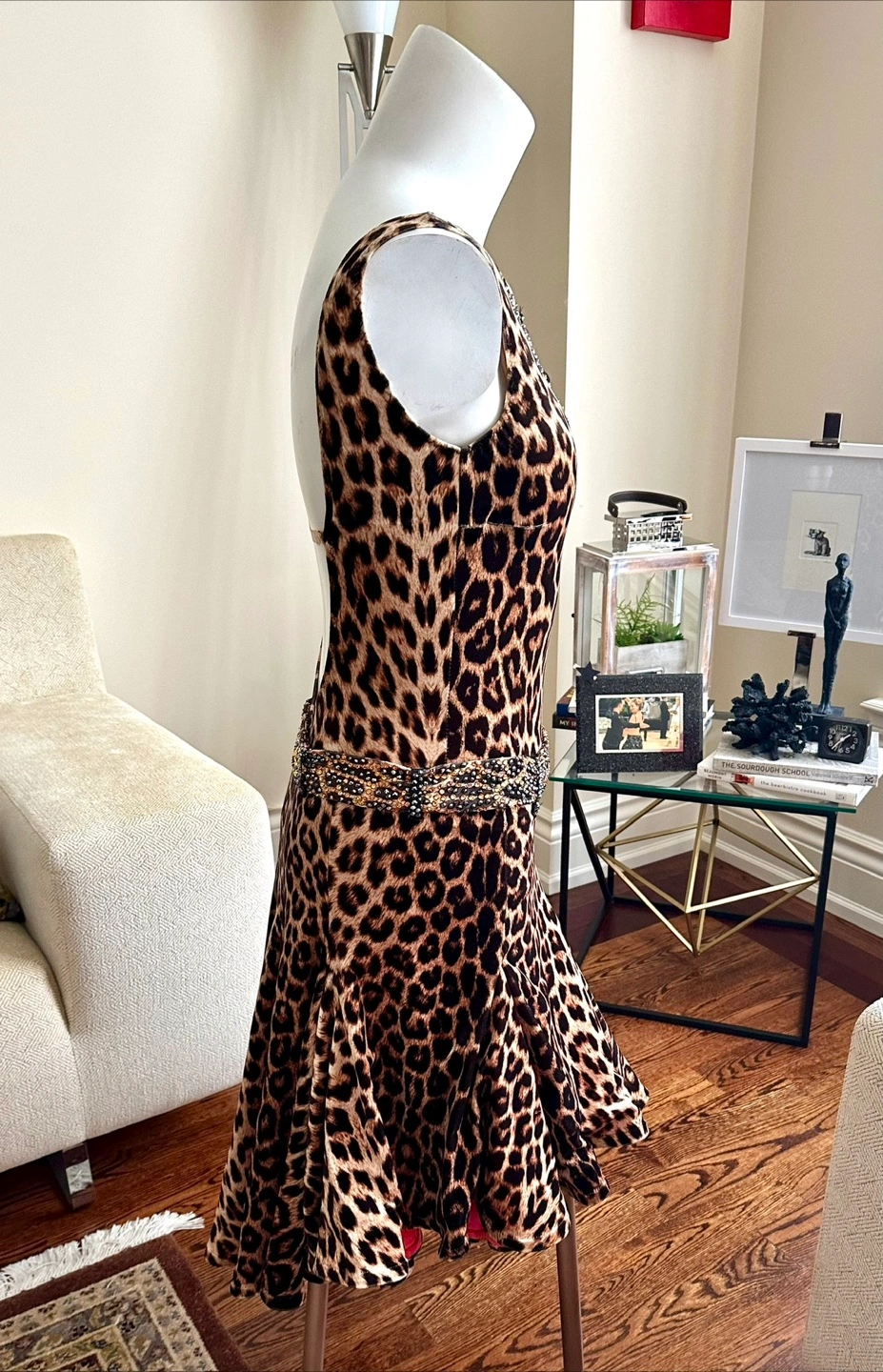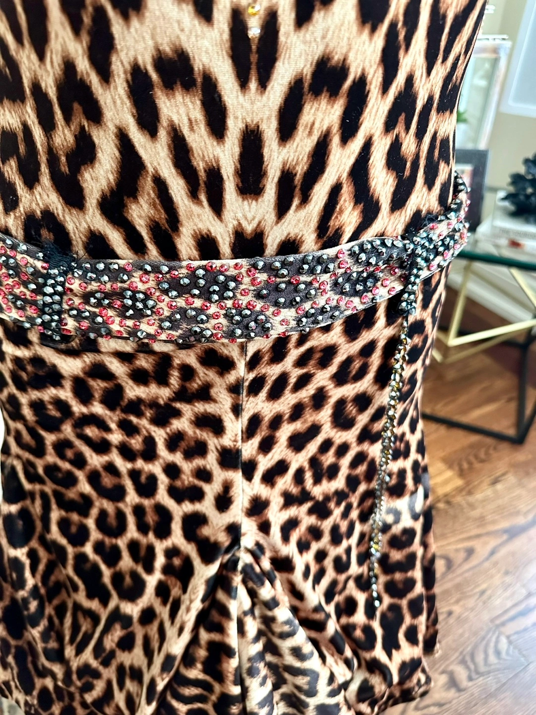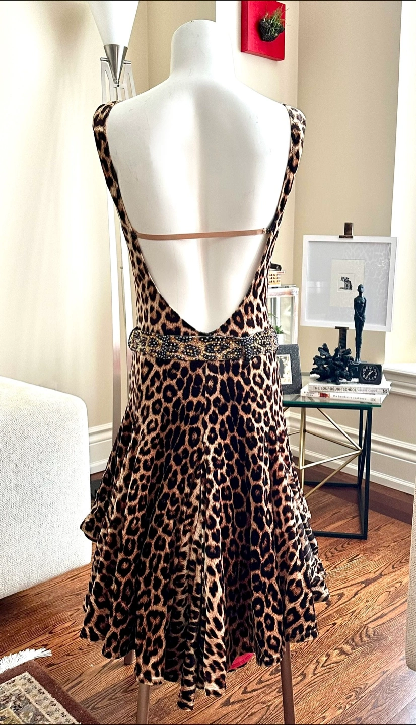 Selling a fun leopard print dress! It has a unique design with Swarovski embellishments around the neckline and waist. Very stretchy European velvet, and red lining. The dress has a flirty, flared skirt and a low back. Body suit is built in for a feminine fit. Perfect for a night out!