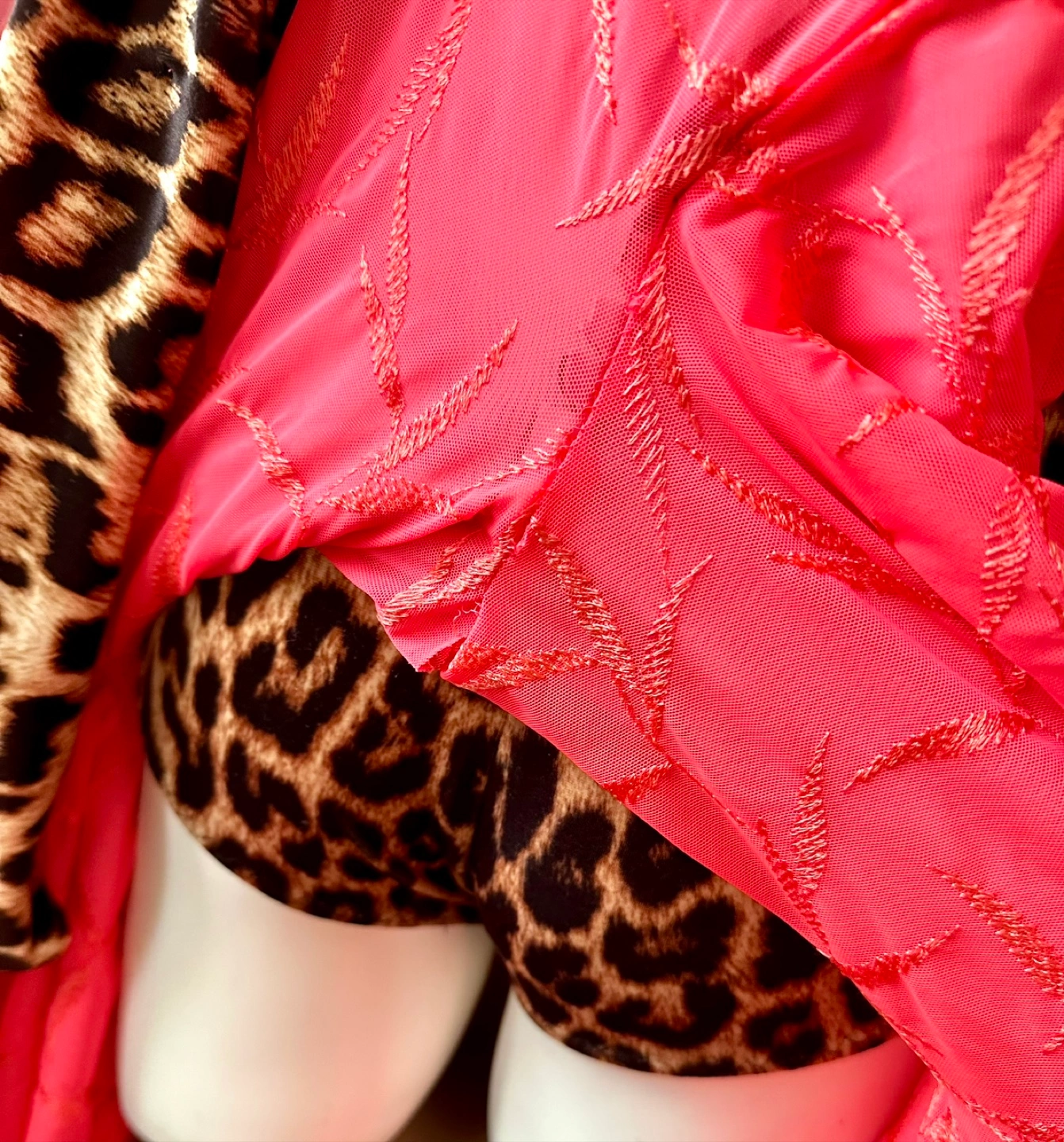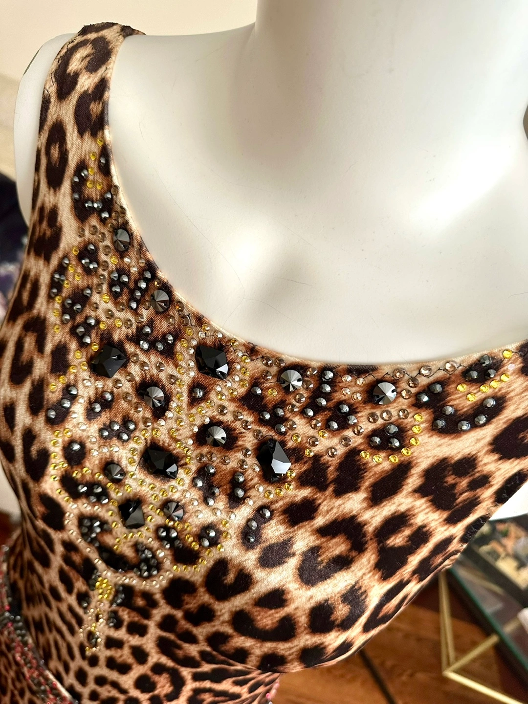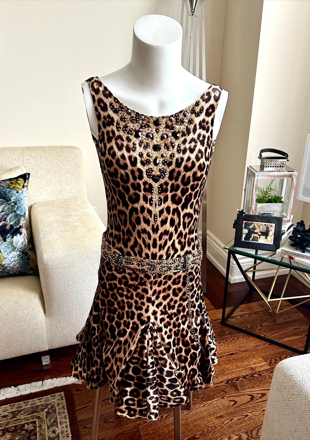 Selling a fun leopard print dress! It has a unique design with Swarovski embellishments around the neckline and waist. Very stretchy European velvet, and red lining. The dress has a flirty, flared skirt and a low back. Body suit is built in for a feminine fit. Perfect for a night out!