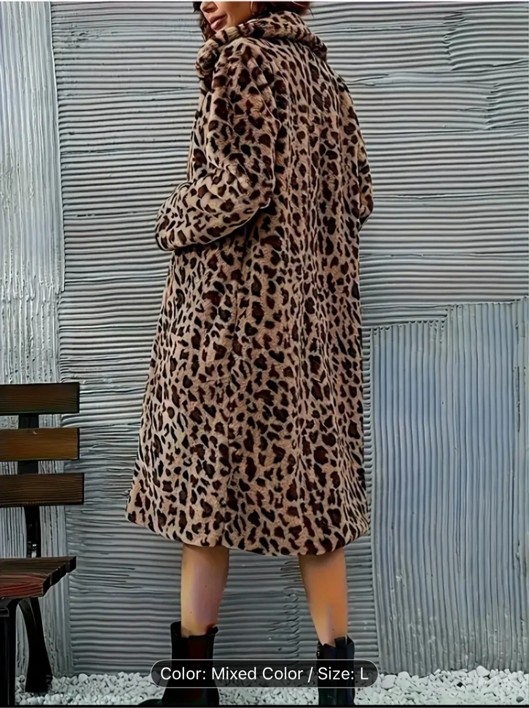 Selling a stylish leopard print faux fur coat in a size large. It's a mixed colour and perfect for adding a touch of fun to your wardrobe. The coat appears to be in great condition and has a soft, plush texture. Great for keeping warm and looking fashionable!