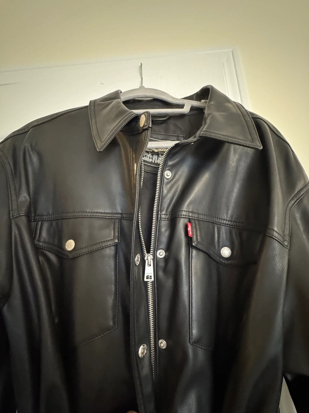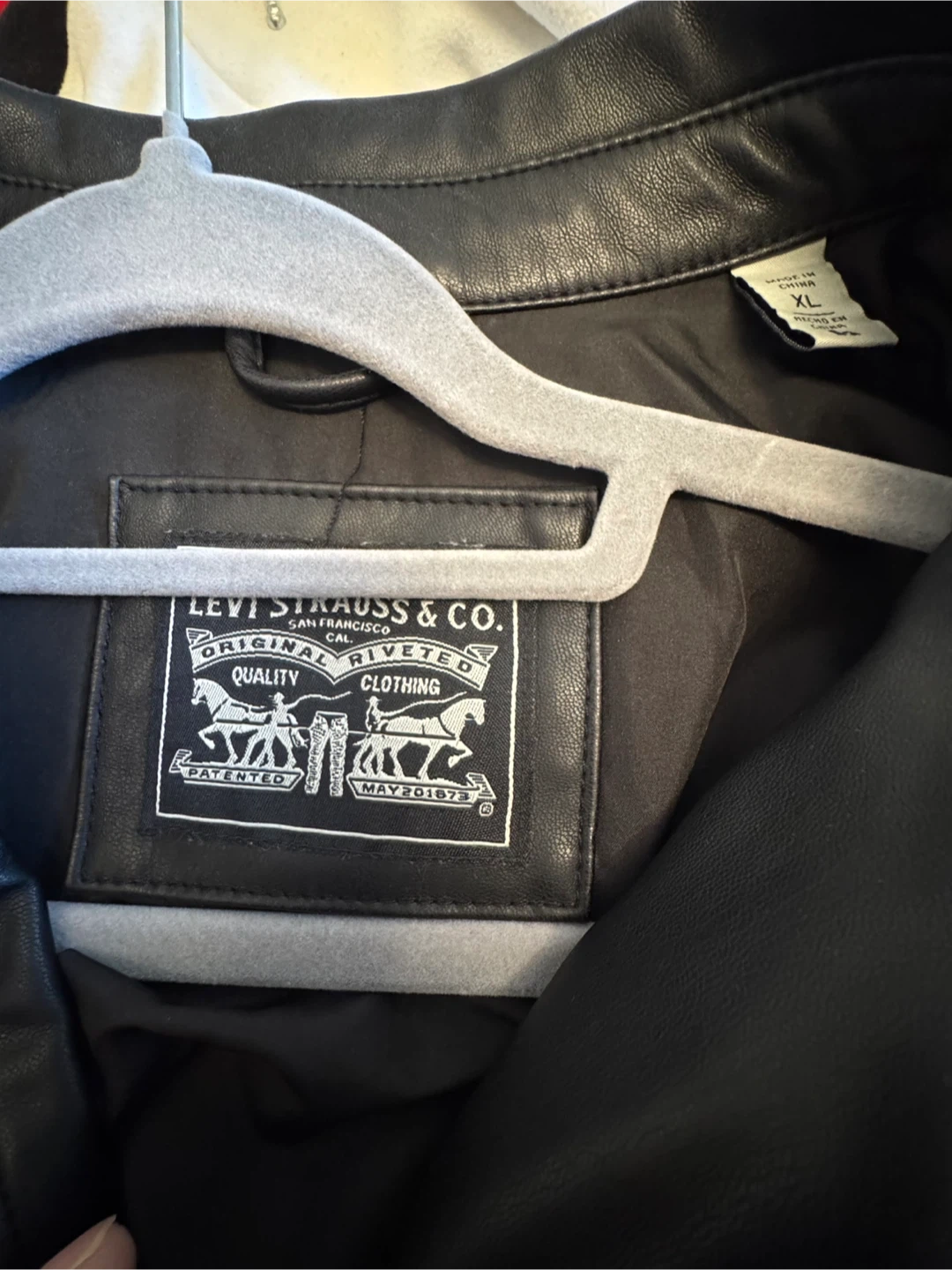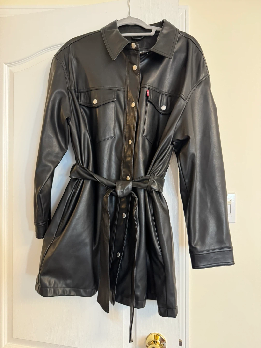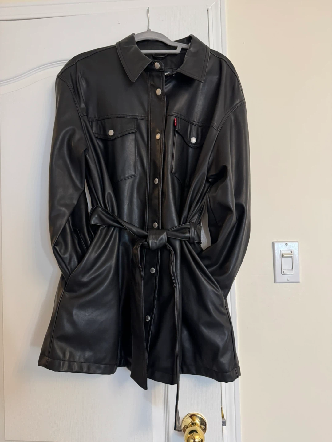 Levi's black faux leather jacket in size XL! This stylish jacket features a belted design and is perfect for adding a chic touch to any outfit. It's in great condition and ready for a new home!