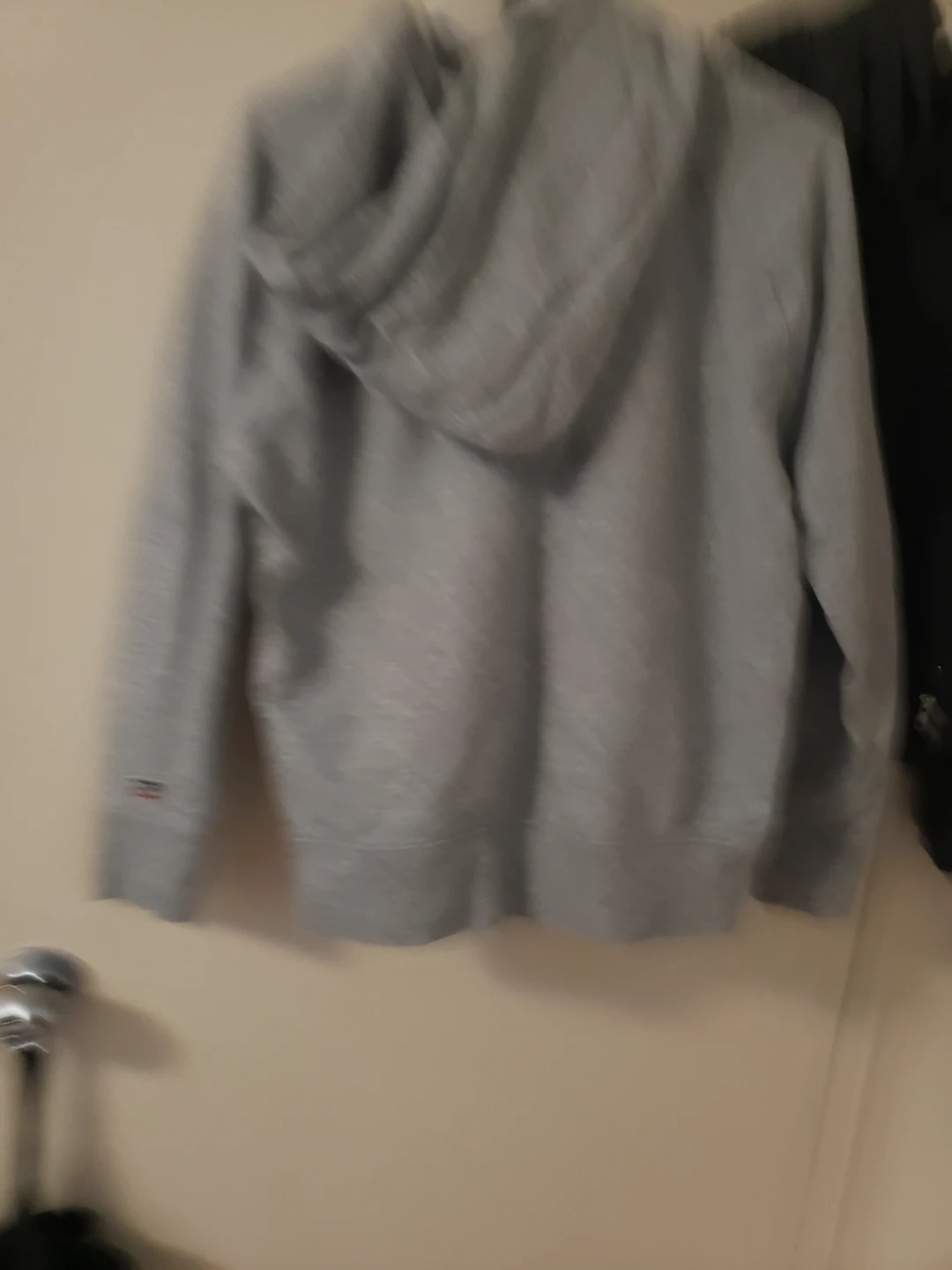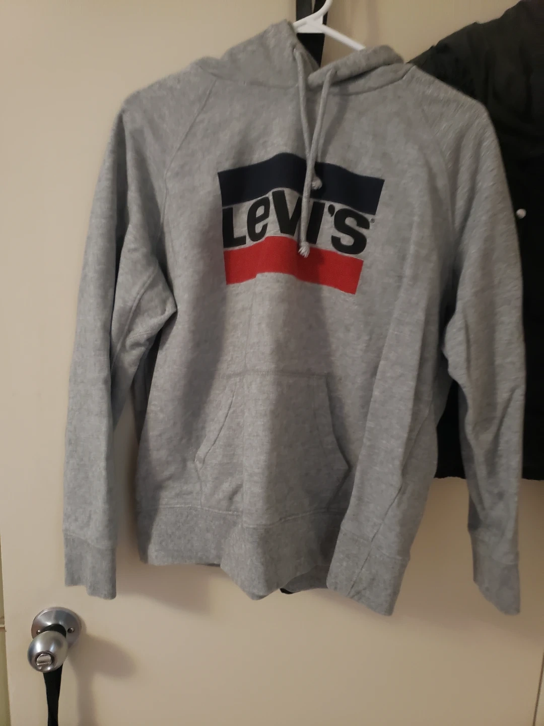 Grey Levi's hoodie. Long sleeves. Front pouch pocket. Drawstring hood.