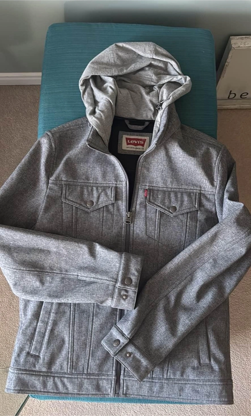 Levi's hooded softshell trucker jacket in a stylish grey colour. It features a full zip closure, buttoned cuffs, and multiple pockets. Perfect for layering and staying comfortable in cooler weather! Size men’s small